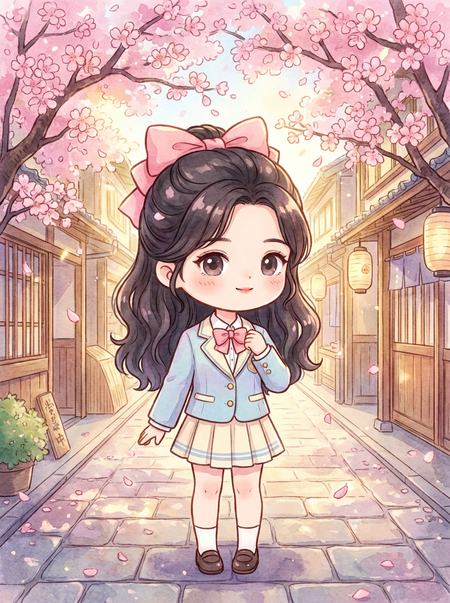 The model as a chibi character standing on a peaceful Japanese street during cherry blossom season, wearing a pastel school uniform with a big bow and wavy hair . The background is filled with pink petals and soft sunlight. Highly detailed chibi-style rendering with vibrant colors and a magical atmosphere.