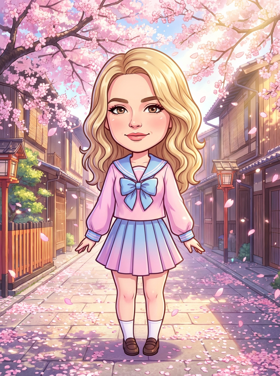 The model as a chibi character standing on a peaceful Japanese street during cherry blossom season, wearing a pastel school uniform with a big bow and wavy hair . The background is filled with pink petals and soft sunlight. Highly detailed chibi-style rendering with vibrant colors and a magical atmosphere.