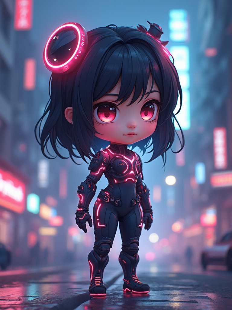 The model as a chibi cyberpunk explorer, with neon highlights and a tiny visor, wearing a futuristic bodysuit with glowing accents . The background is a mini cityscape with glowing signs. The style is in cute chibi anime illustration.