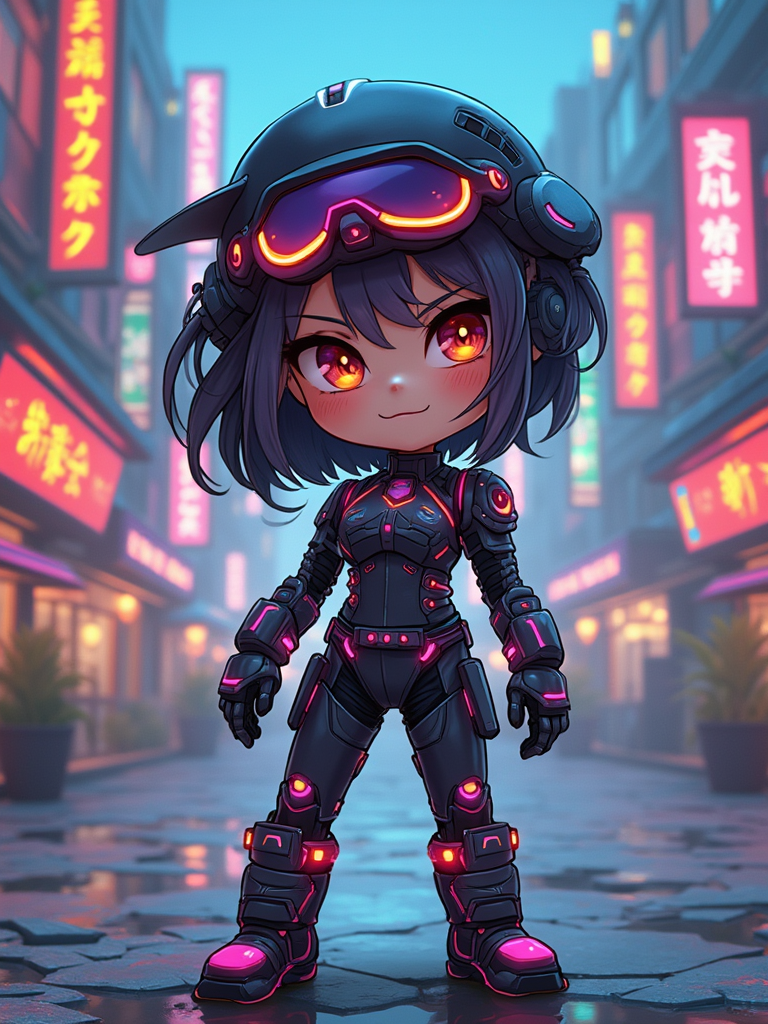 The model as a chibi cyberpunk explorer, with neon highlights and a tiny visor, wearing a futuristic bodysuit with glowing accents . The background is a mini cityscape with glowing signs. The style is in cute chibi anime illustration.
