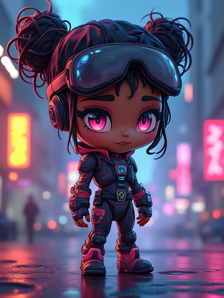 The model as a chibi cyberpunk explorer, with neon highlights and a tiny visor, wearing a futuristic bodysuit with glowing accents . The background is a mini cityscape with glowing signs. The style is in cute chibi anime illustration.
