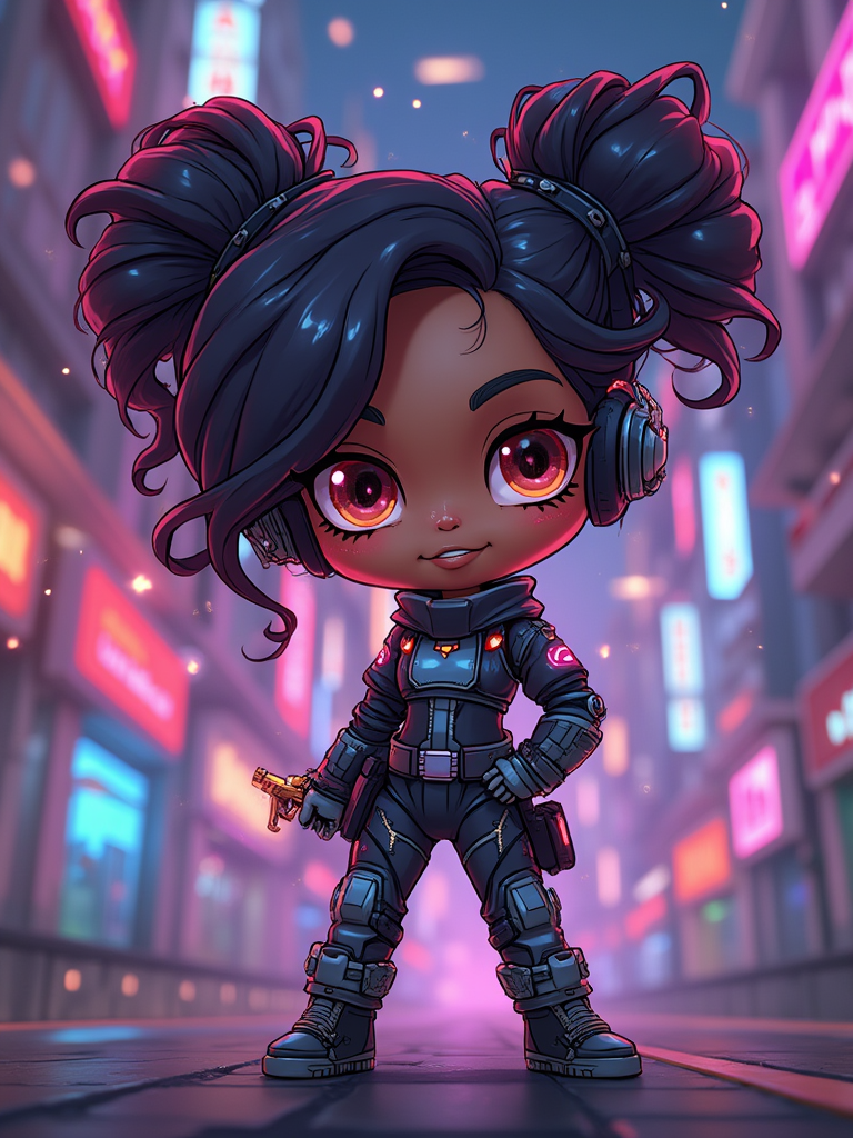The model as a chibi cyberpunk explorer, with neon highlights and a tiny visor, wearing a futuristic bodysuit with glowing accents . The background is a mini cityscape with glowing signs. The style is in cute chibi anime illustration.