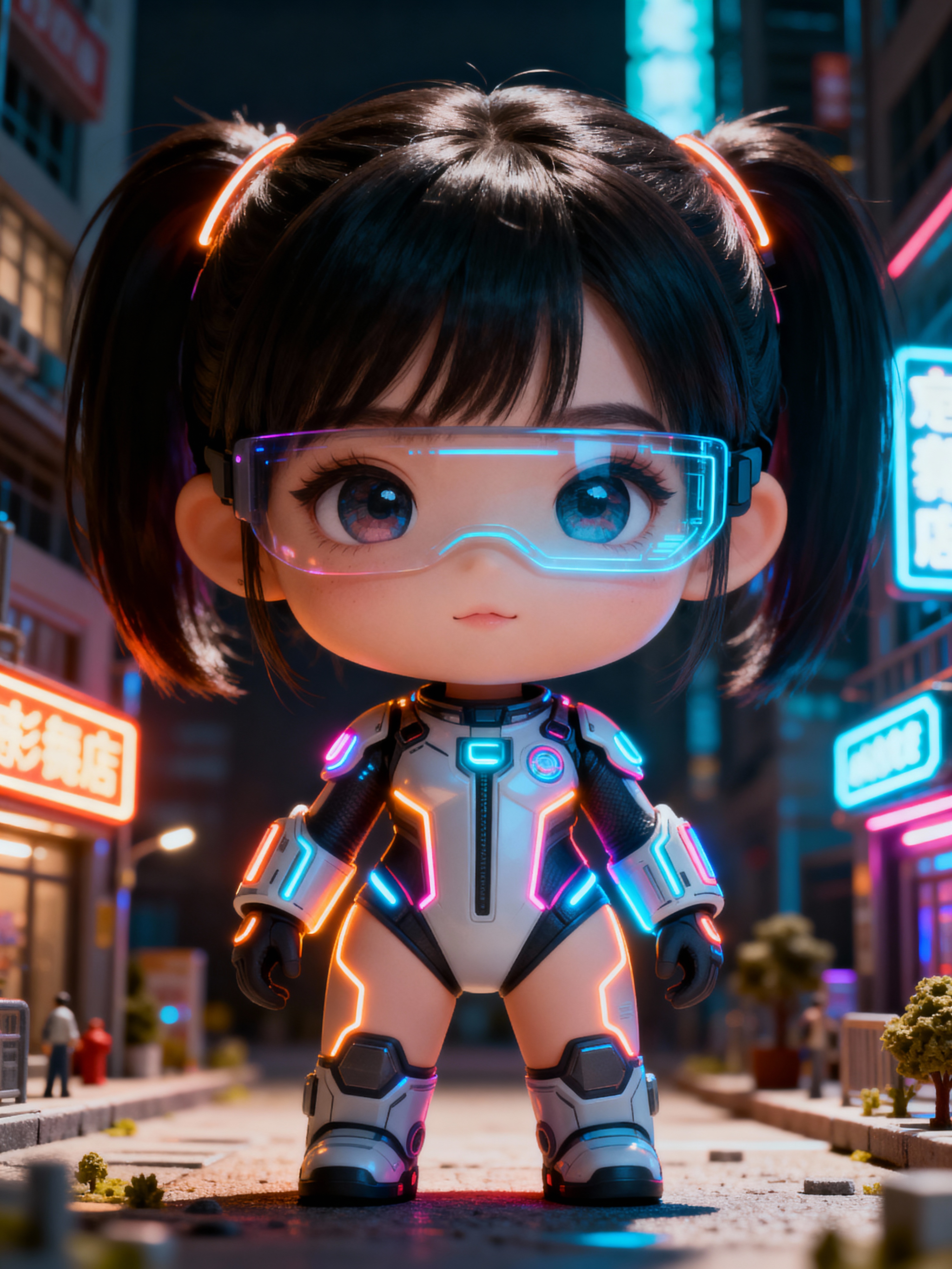 The model as a chibi cyberpunk explorer, with neon highlights and a tiny visor, wearing a futuristic bodysuit with glowing accents . The background is a mini cityscape with glowing signs. The style is in cute chibi anime illustration.