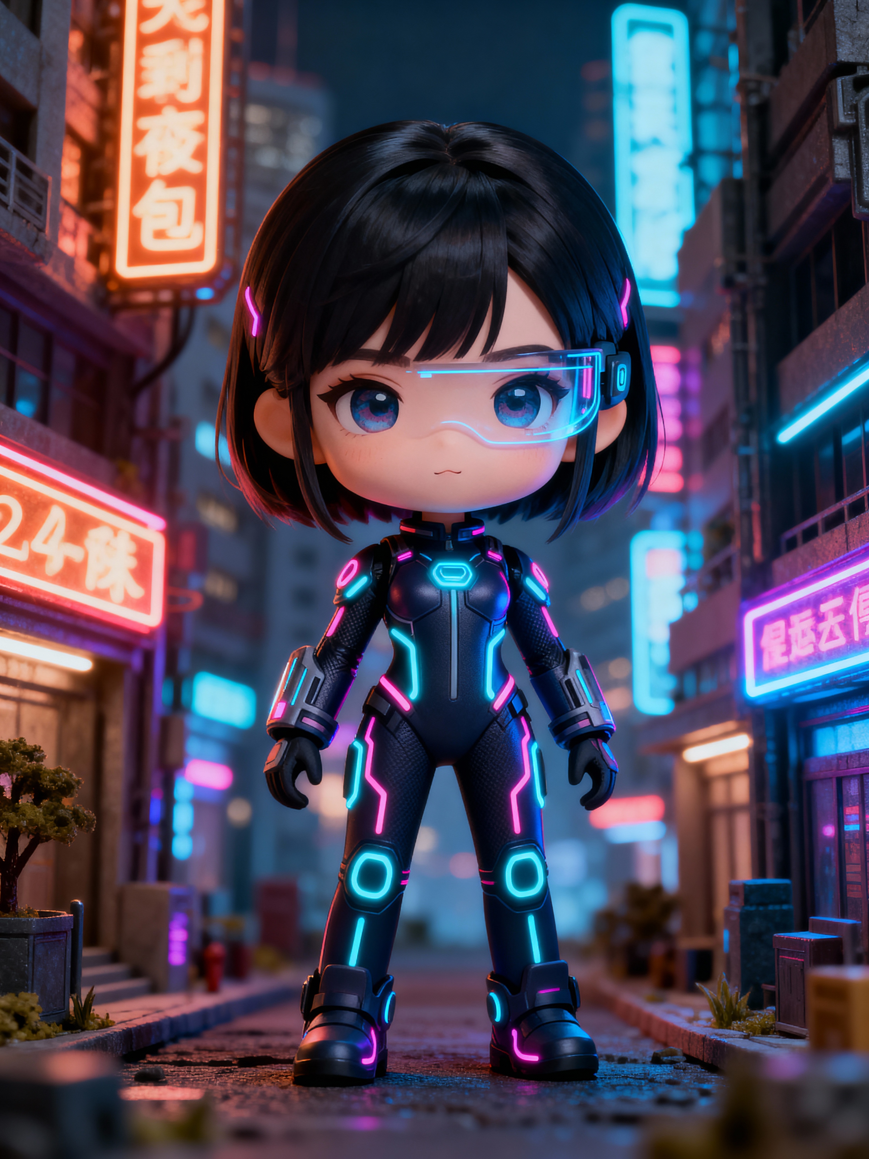 The model as a chibi cyberpunk explorer, with neon highlights and a tiny visor, wearing a futuristic bodysuit with glowing accents . The background is a mini cityscape with glowing signs. The style is in cute chibi anime illustration.