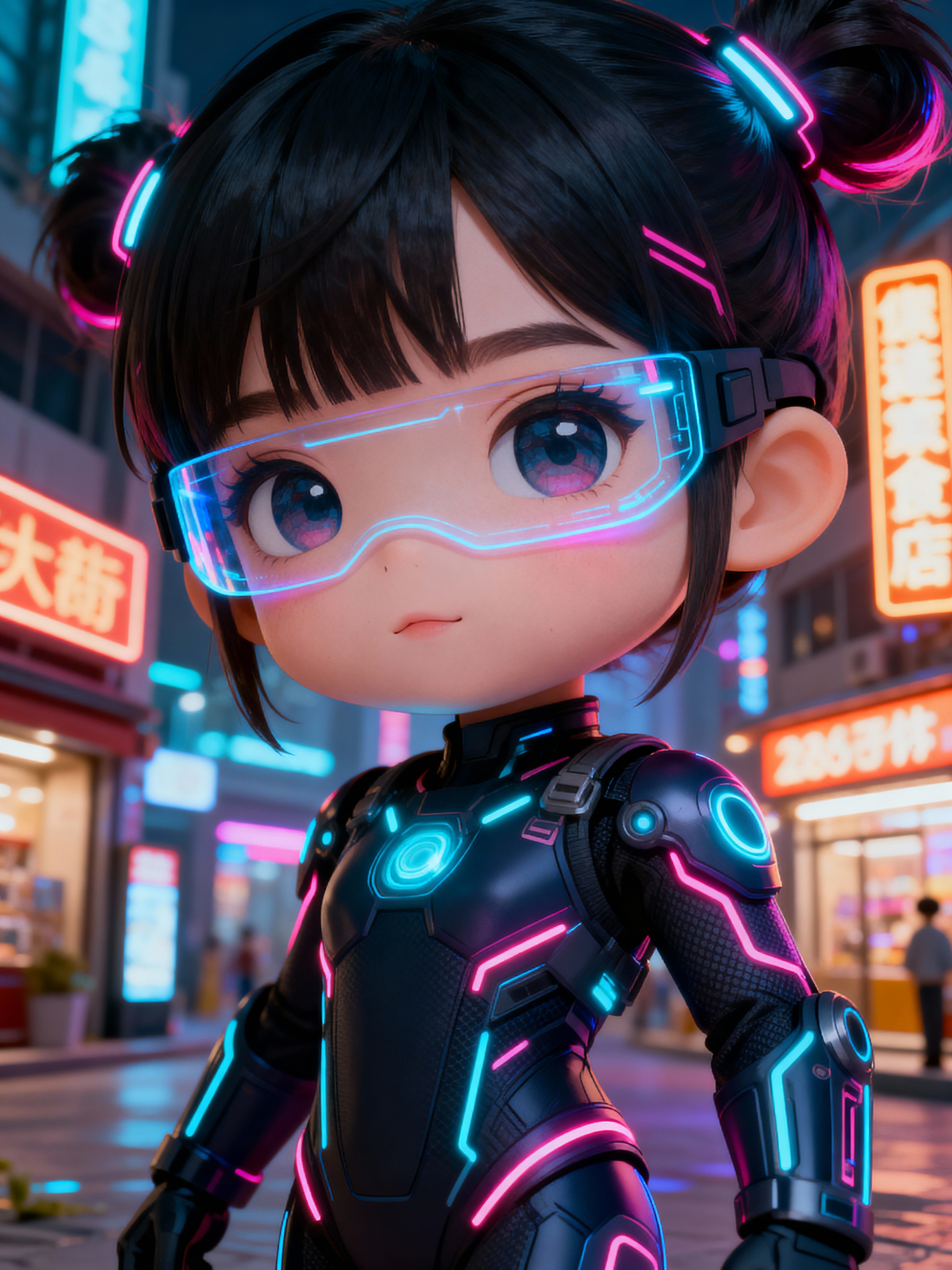 The model as a chibi cyberpunk explorer, with neon highlights and a tiny visor, wearing a futuristic bodysuit with glowing accents . The background is a mini cityscape with glowing signs. The style is in cute chibi anime illustration.