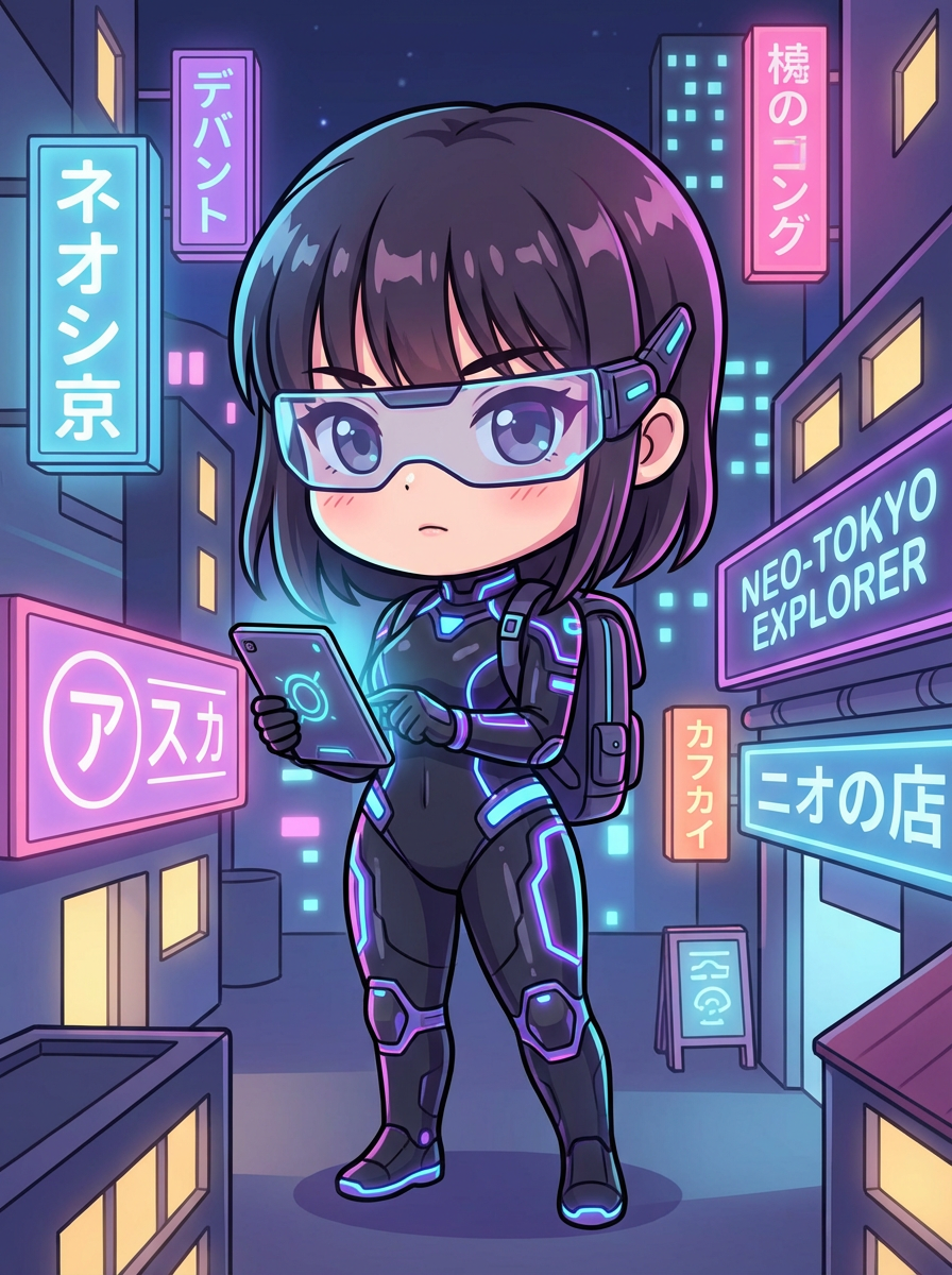 The model as a chibi cyberpunk explorer, with neon highlights and a tiny visor, wearing a futuristic bodysuit with glowing accents . The background is a mini cityscape with glowing signs. The style is in cute chibi anime illustration.