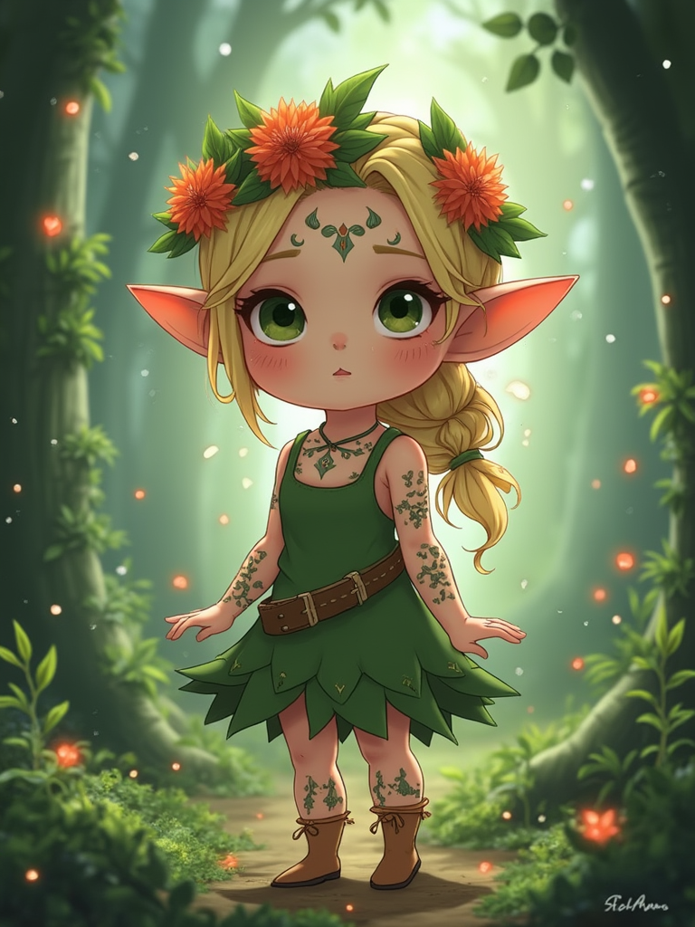 The model as a chibi elf with pointy ears and glowing tattoos, dressed in a leafy dress with flower crown . The setting is a magical forest. The style is in cute chibi anime illustration.