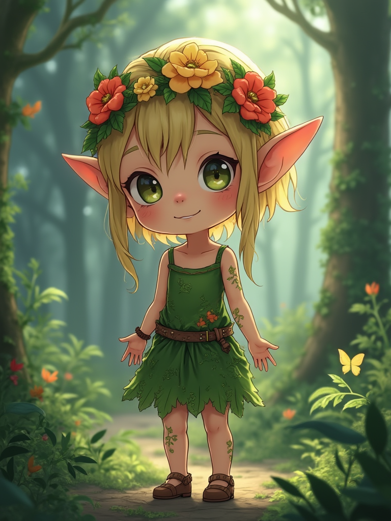 The model as a chibi elf with pointy ears and glowing tattoos, dressed in a leafy dress with flower crown . The setting is a magical forest. The style is in cute chibi anime illustration.