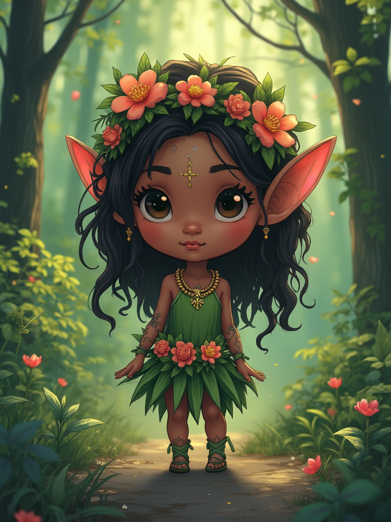 The model as a chibi elf with pointy ears and glowing tattoos, dressed in a leafy dress with flower crown . The setting is a magical forest. The style is in cute chibi anime illustration.