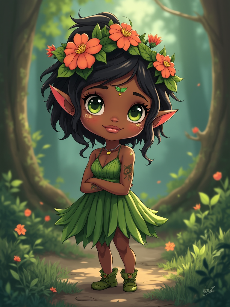 The model as a chibi elf with pointy ears and glowing tattoos, dressed in a leafy dress with flower crown . The setting is a magical forest. The style is in cute chibi anime illustration.