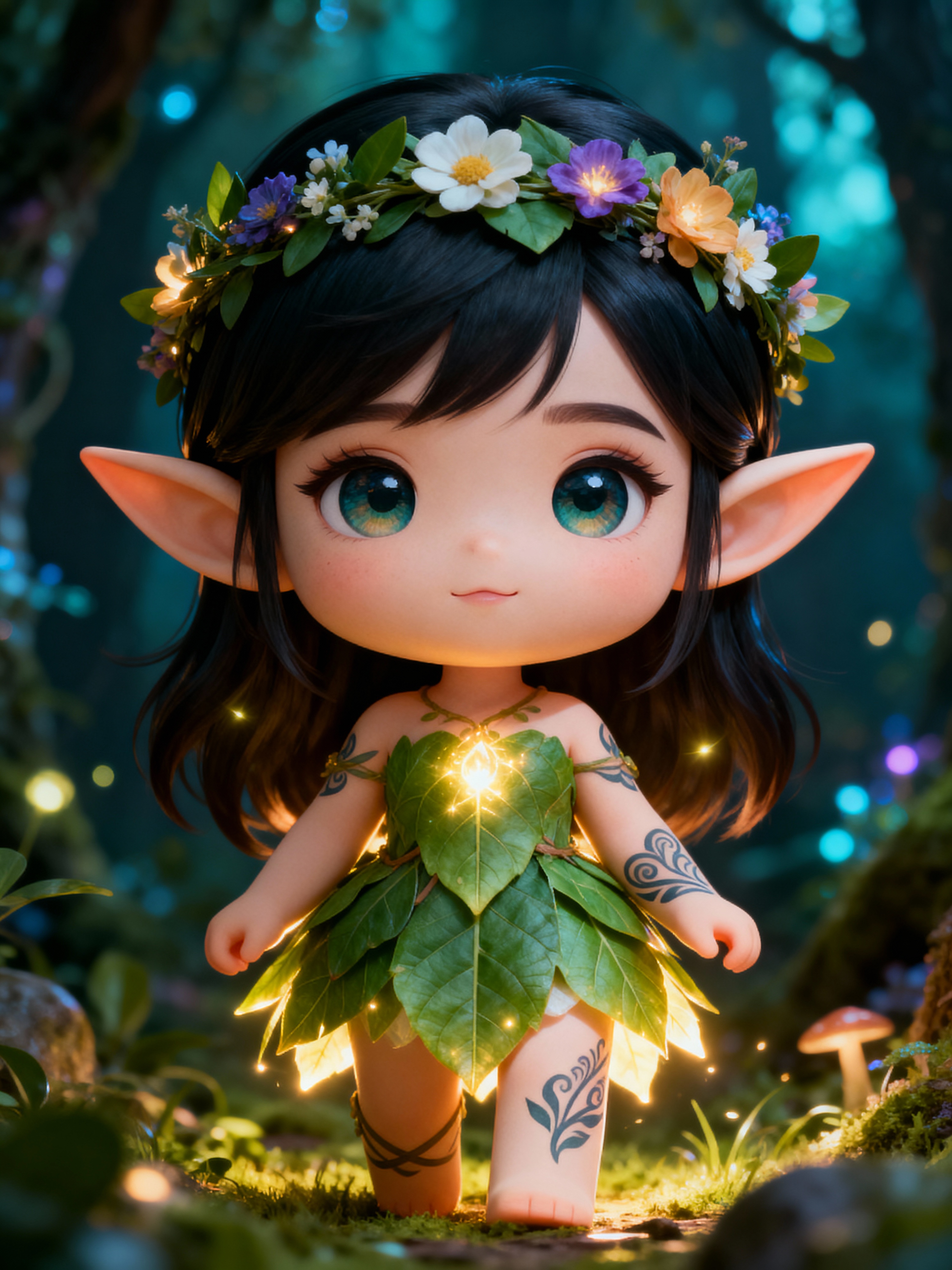 The model as a chibi elf with pointy ears and glowing tattoos, dressed in a leafy dress with flower crown . The setting is a magical forest. The style is in cute chibi anime illustration.