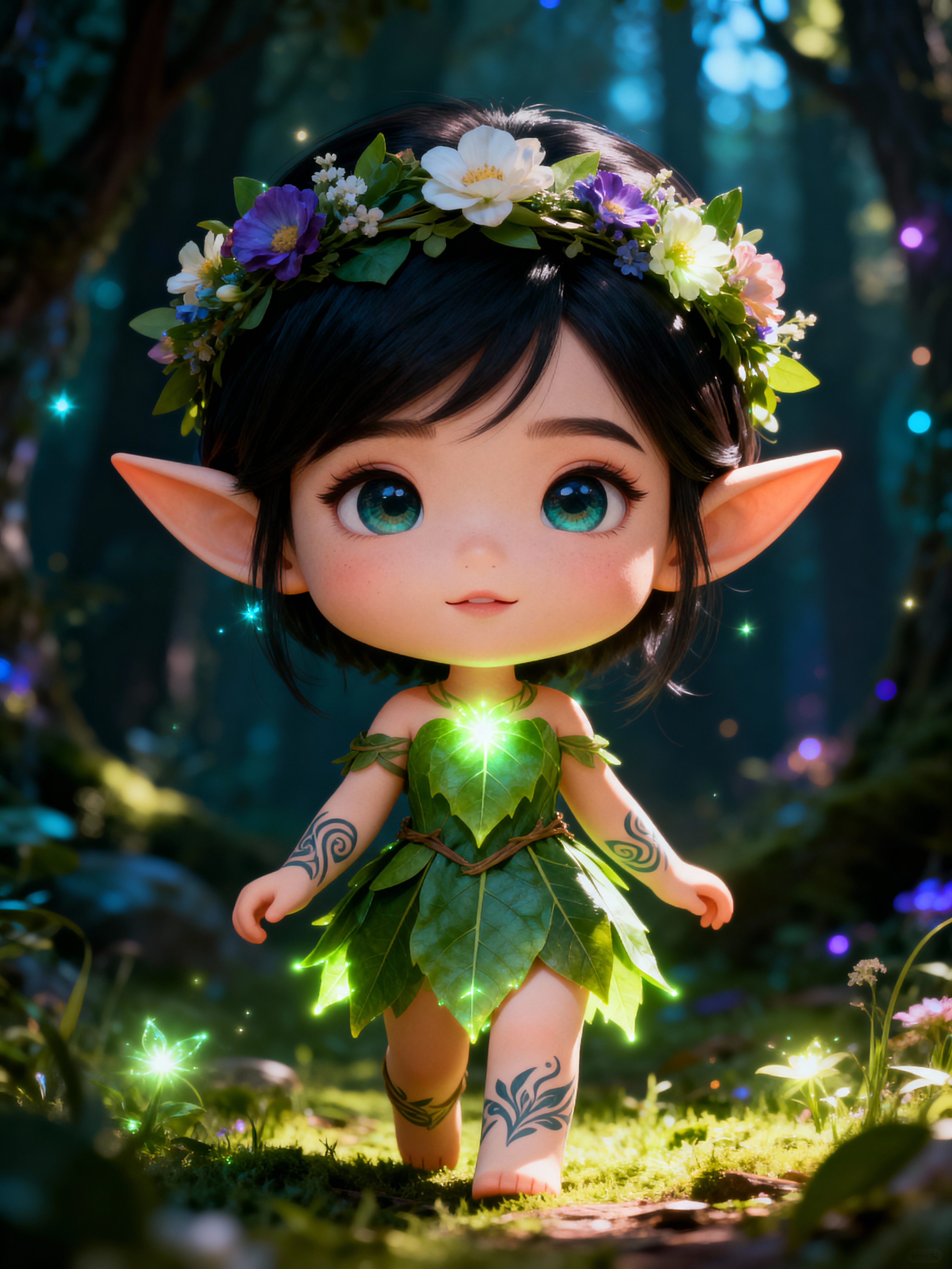 The model as a chibi elf with pointy ears and glowing tattoos, dressed in a leafy dress with flower crown . The setting is a magical forest. The style is in cute chibi anime illustration.