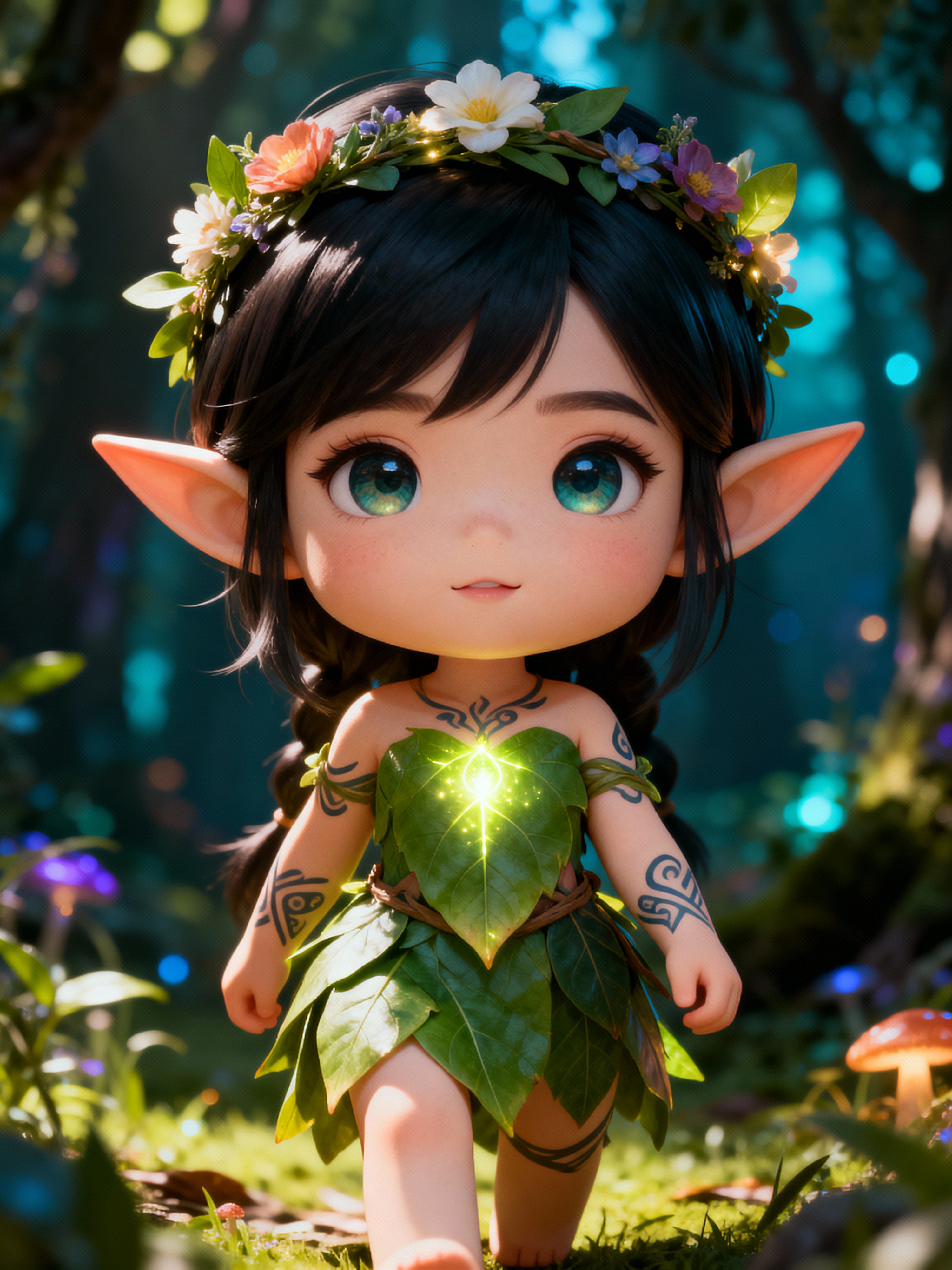 The model as a chibi elf with pointy ears and glowing tattoos, dressed in a leafy dress with flower crown . The setting is a magical forest. The style is in cute chibi anime illustration.