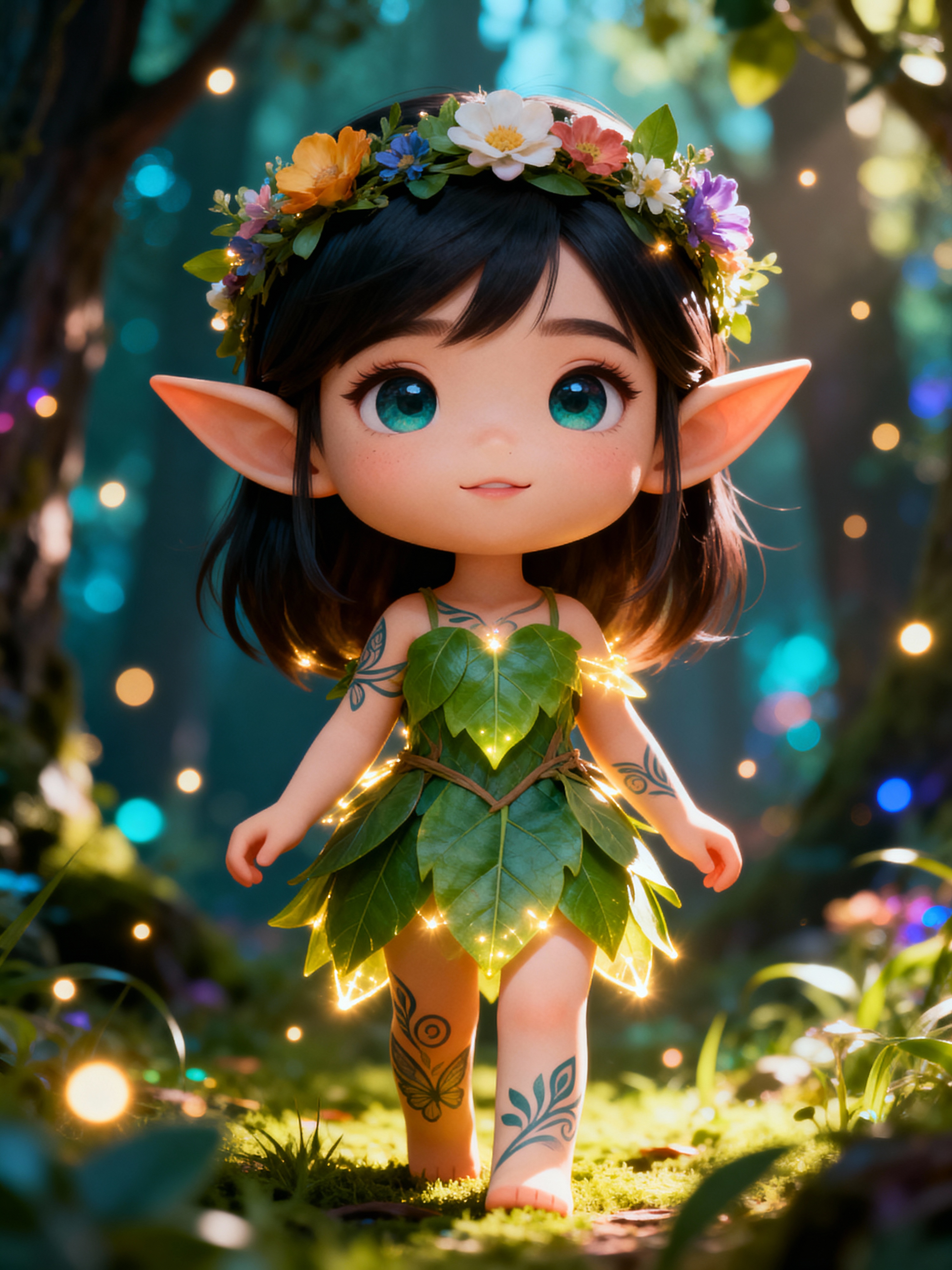 The model as a chibi elf with pointy ears and glowing tattoos, dressed in a leafy dress with flower crown . The setting is a magical forest. The style is in cute chibi anime illustration.