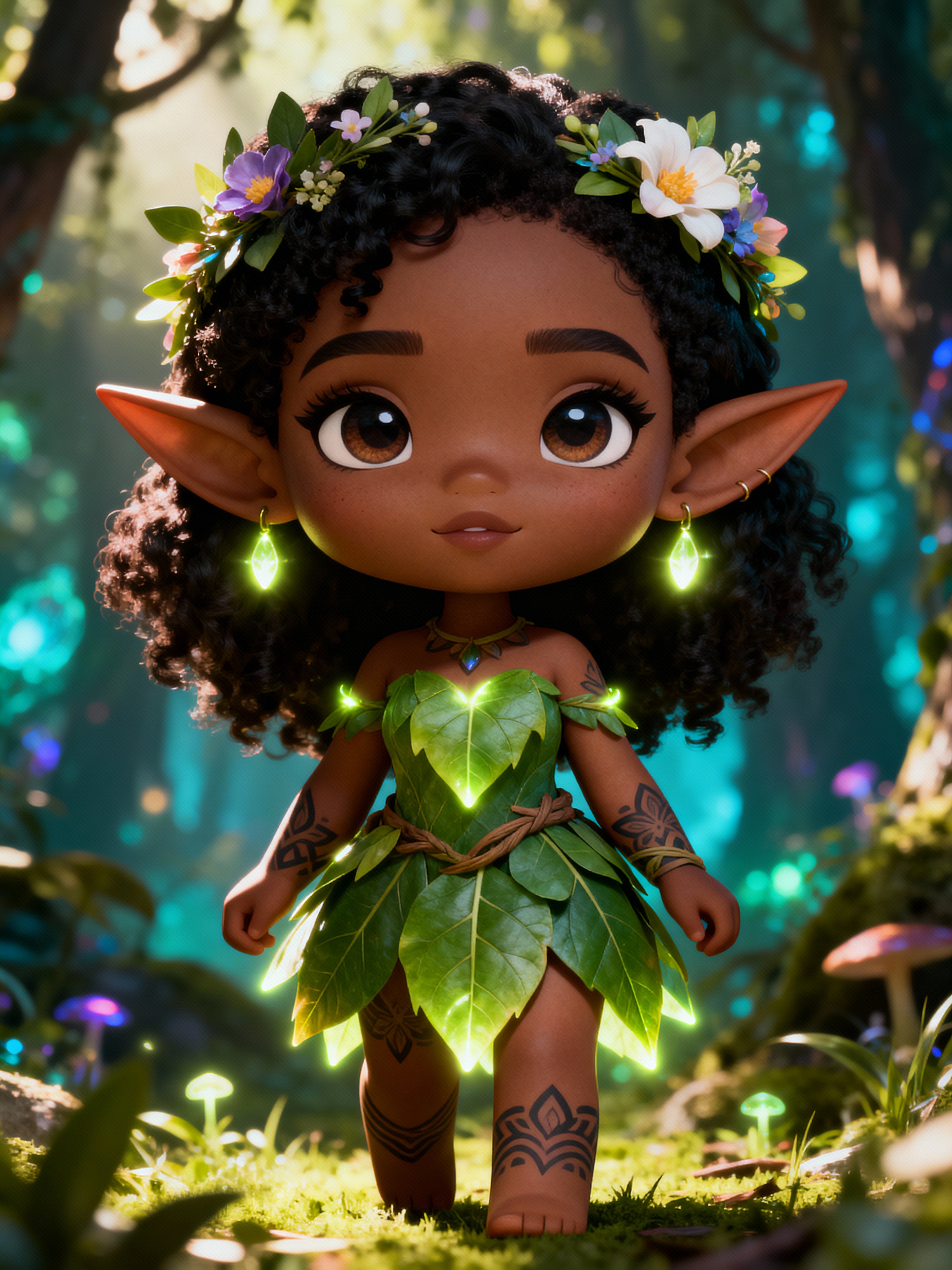 The model as a chibi elf with pointy ears and glowing tattoos, dressed in a leafy dress with flower crown . The setting is a magical forest. The style is in cute chibi anime illustration.