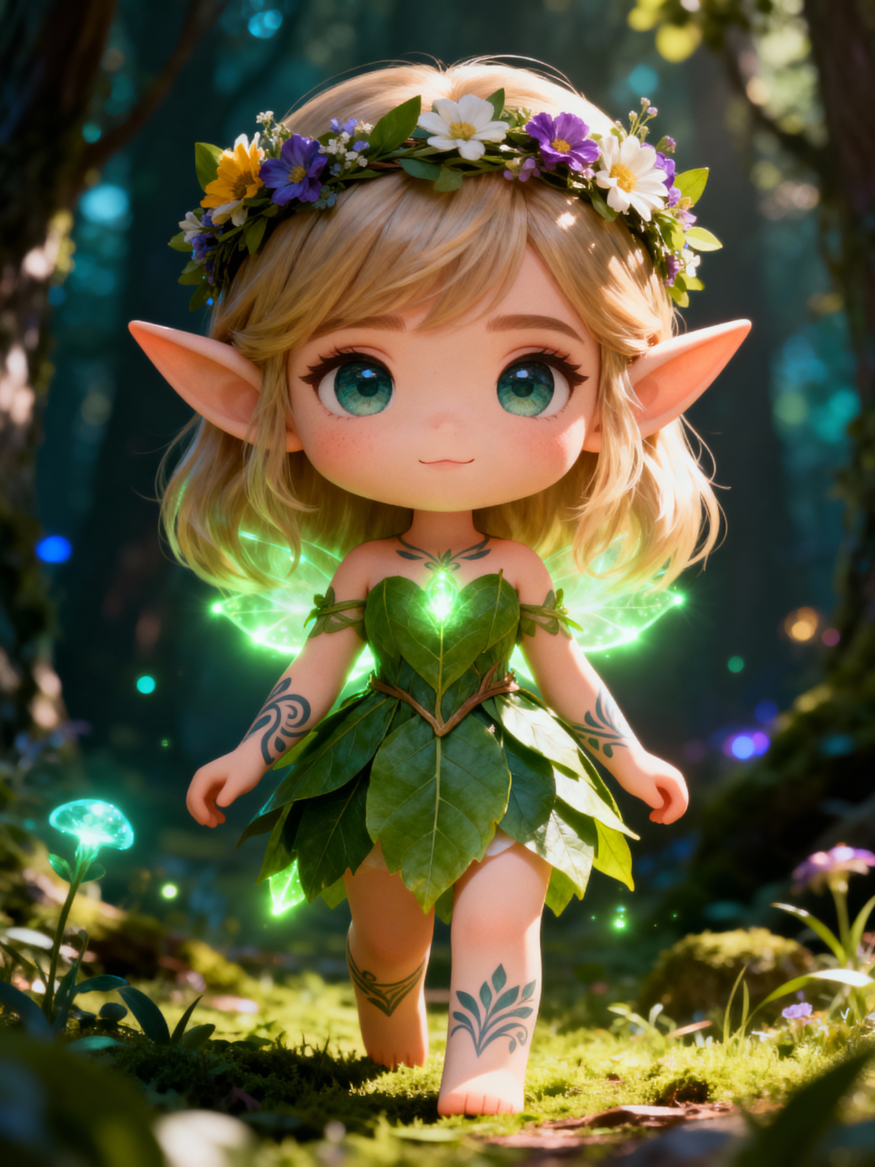 The model as a chibi elf with pointy ears and glowing tattoos, dressed in a leafy dress with flower crown . The setting is a magical forest. The style is in cute chibi anime illustration.