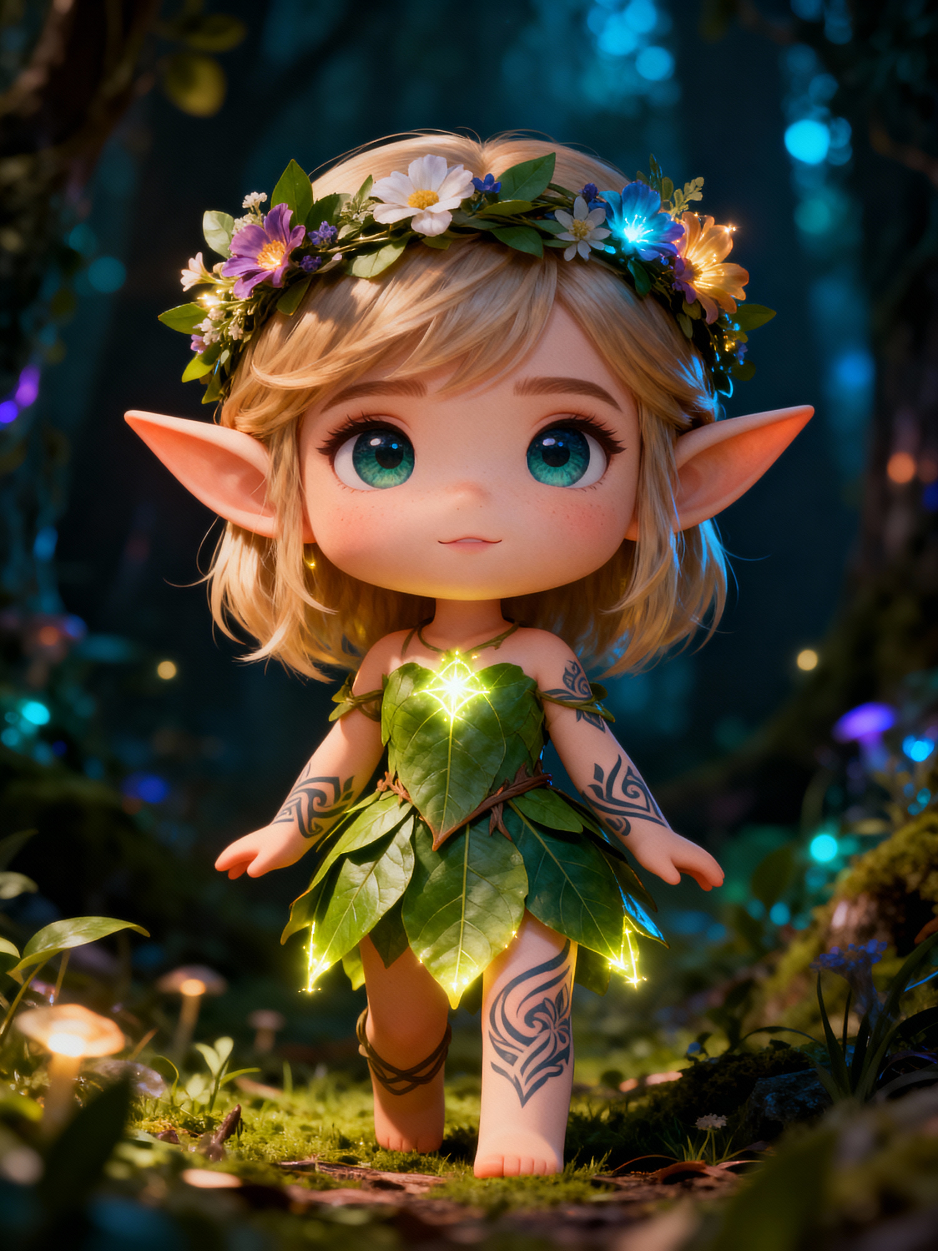 The model as a chibi elf with pointy ears and glowing tattoos, dressed in a leafy dress with flower crown . The setting is a magical forest. The style is in cute chibi anime illustration.