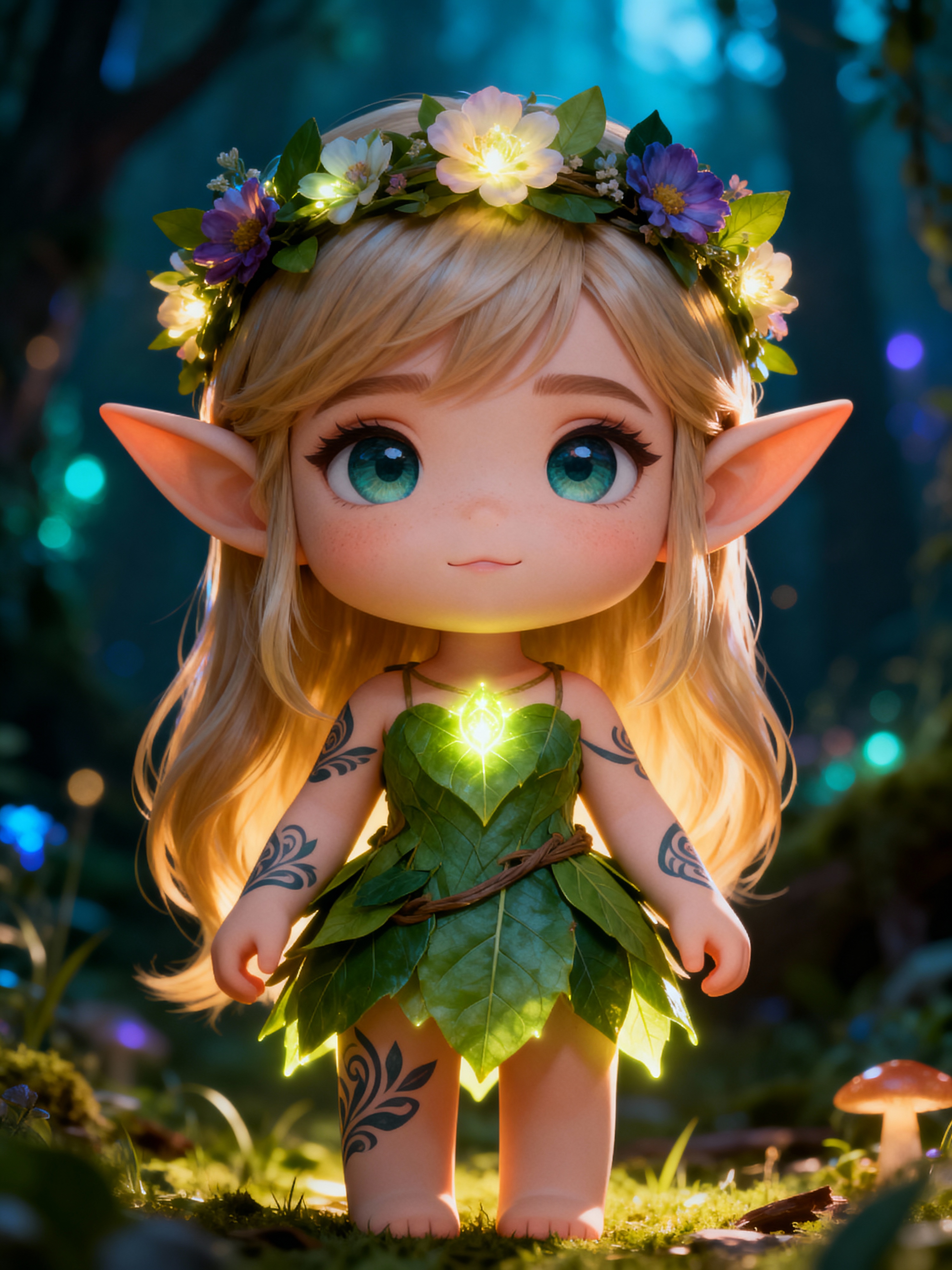 The model as a chibi elf with pointy ears and glowing tattoos, dressed in a leafy dress with flower crown . The setting is a magical forest. The style is in cute chibi anime illustration.