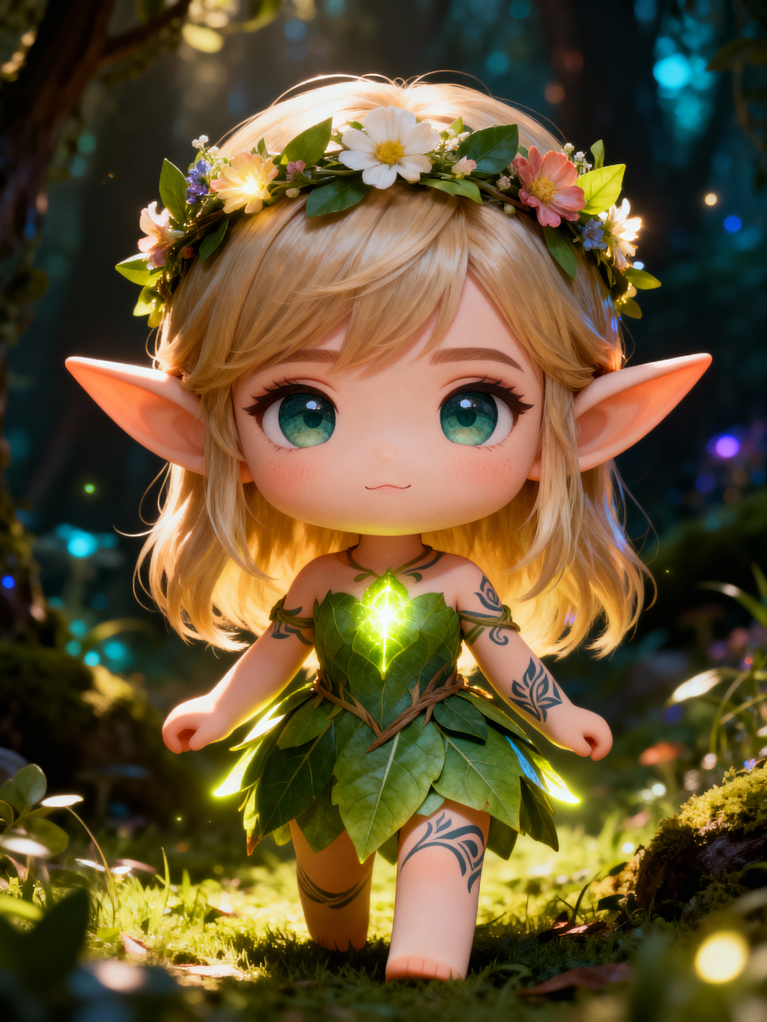 The model as a chibi elf with pointy ears and glowing tattoos, dressed in a leafy dress with flower crown . The setting is a magical forest. The style is in cute chibi anime illustration.
