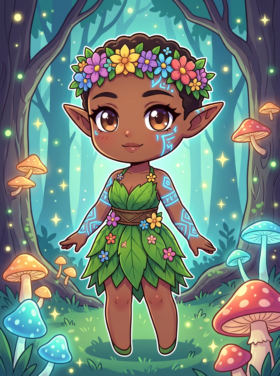 The model as a chibi elf with pointy ears and glowing tattoos, dressed in a leafy dress with flower crown . The setting is a magical forest. The style is in cute chibi anime illustration.