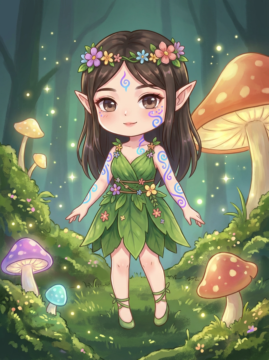 The model as a chibi elf with pointy ears and glowing tattoos, dressed in a leafy dress with flower crown . The setting is a magical forest. The style is in cute chibi anime illustration.