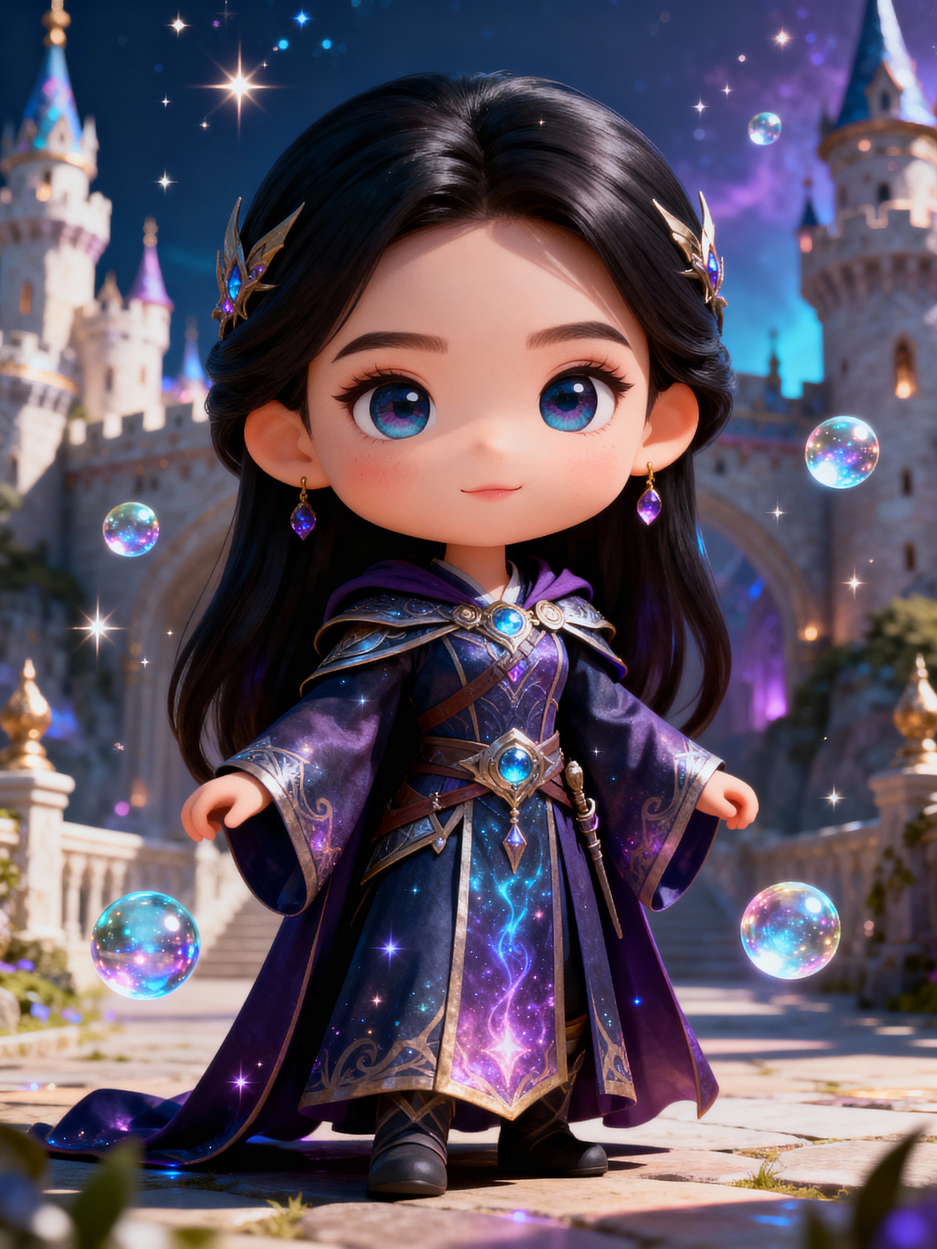 The model as a chibi fantasy warrior, dressed in a magical sorceress robe with floating orbs . The setting is a magical castle with sparkles. The style is in cute chibi anime illustration.