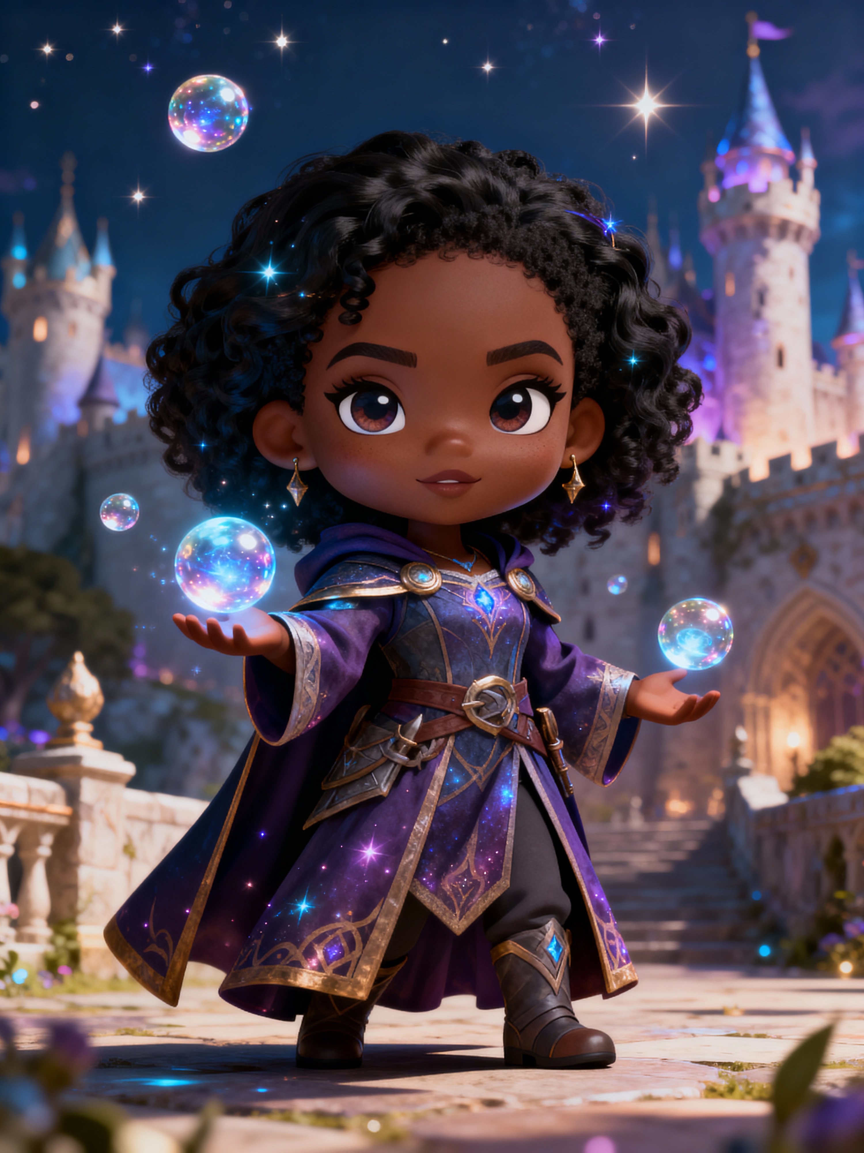 The model as a chibi fantasy warrior, dressed in a magical sorceress robe with floating orbs . The setting is a magical castle with sparkles. The style is in cute chibi anime illustration.