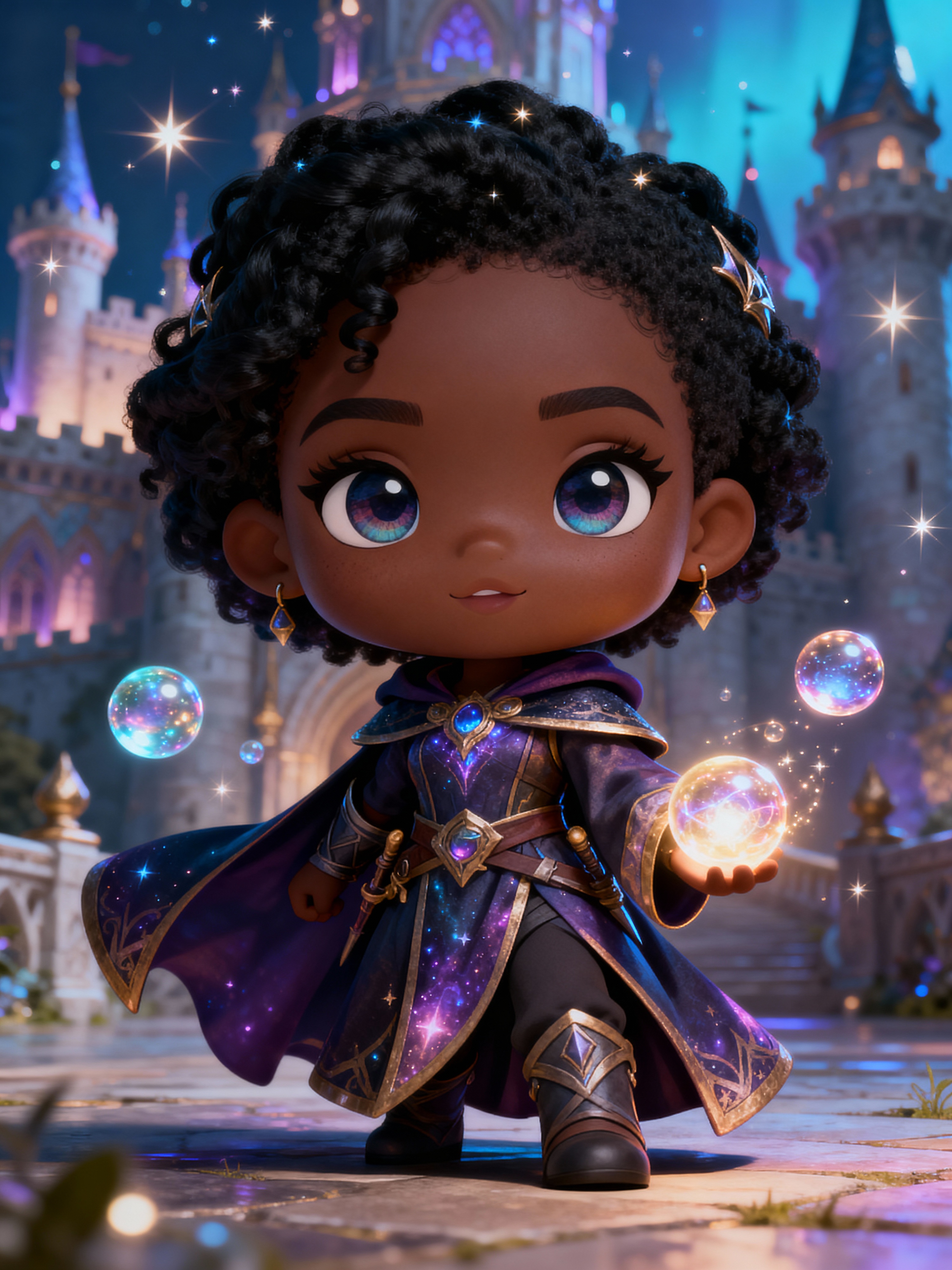 The model as a chibi fantasy warrior, dressed in a magical sorceress robe with floating orbs . The setting is a magical castle with sparkles. The style is in cute chibi anime illustration.