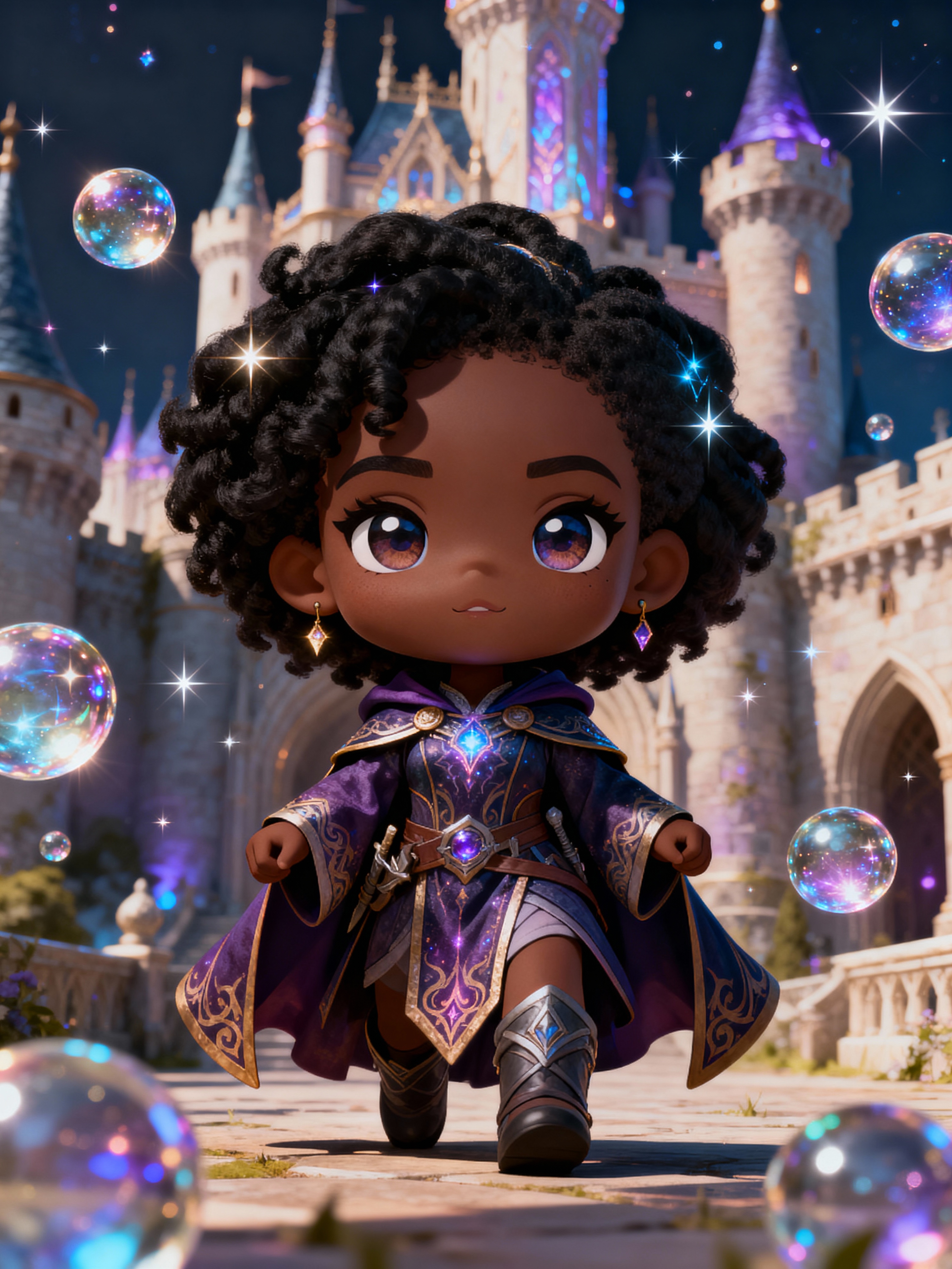 The model as a chibi fantasy warrior, dressed in a magical sorceress robe with floating orbs . The setting is a magical castle with sparkles. The style is in cute chibi anime illustration.