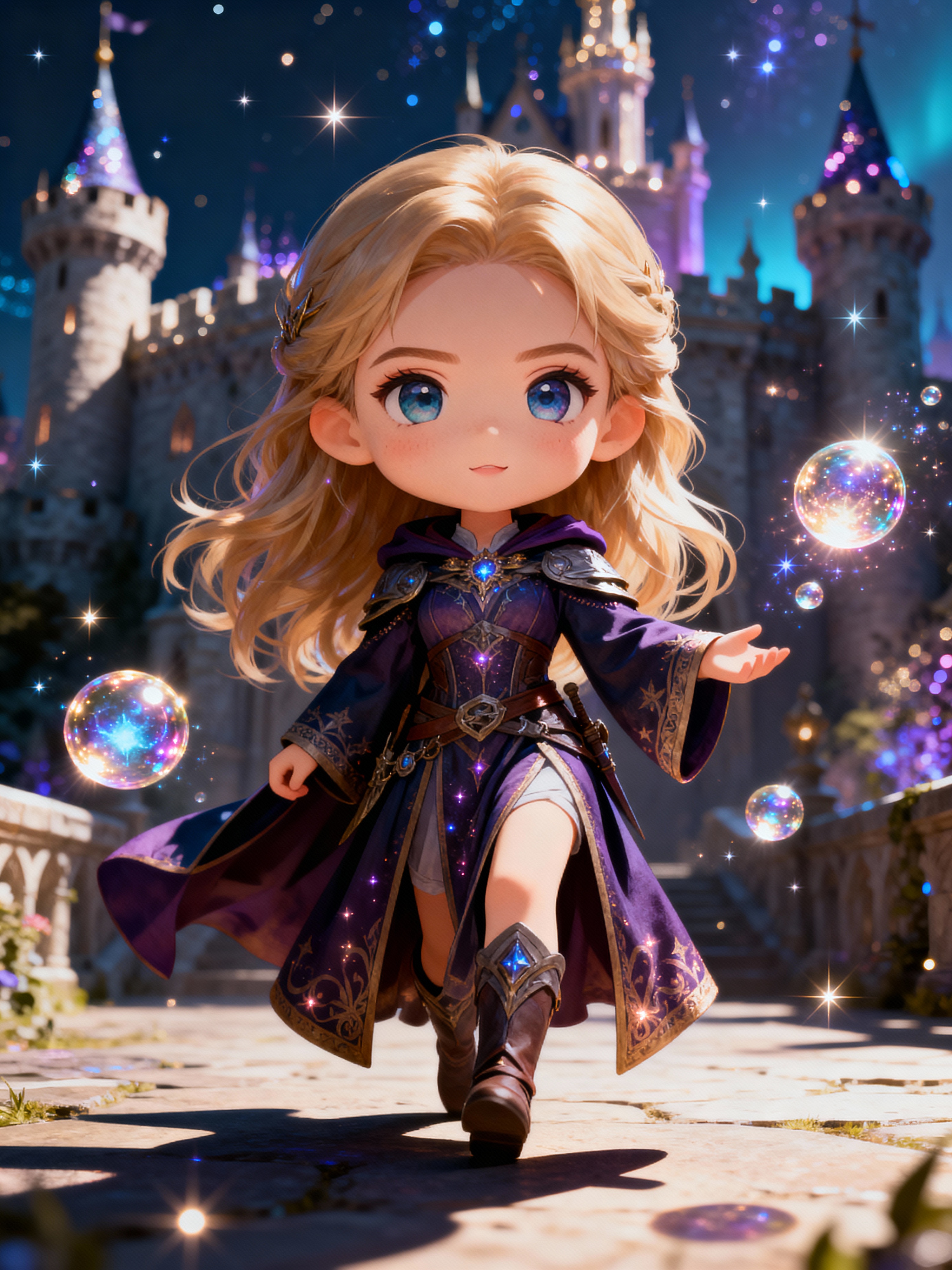 The model as a chibi fantasy warrior, dressed in a magical sorceress robe with floating orbs . The setting is a magical castle with sparkles. The style is in cute chibi anime illustration.