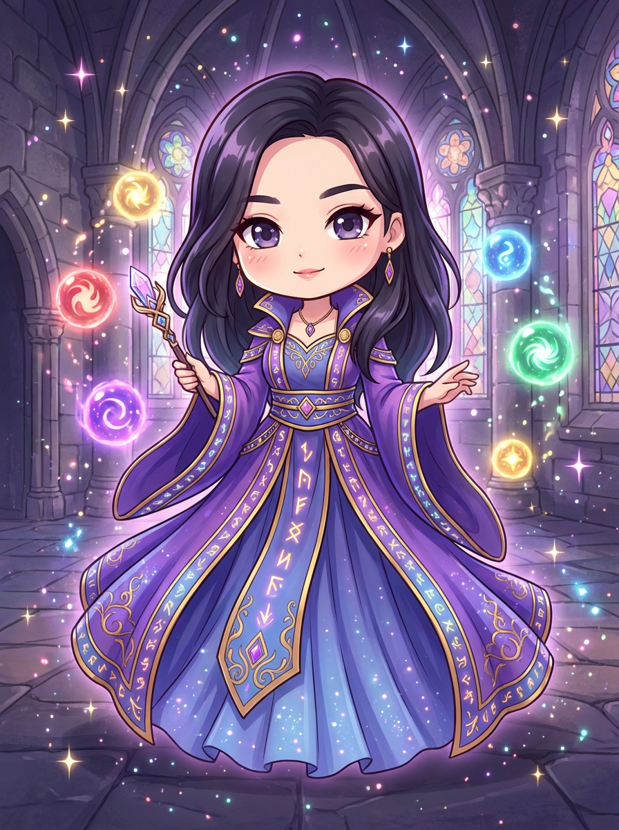 The model as a chibi fantasy warrior, dressed in a magical sorceress robe with floating orbs . The setting is a magical castle with sparkles. The style is in cute chibi anime illustration.