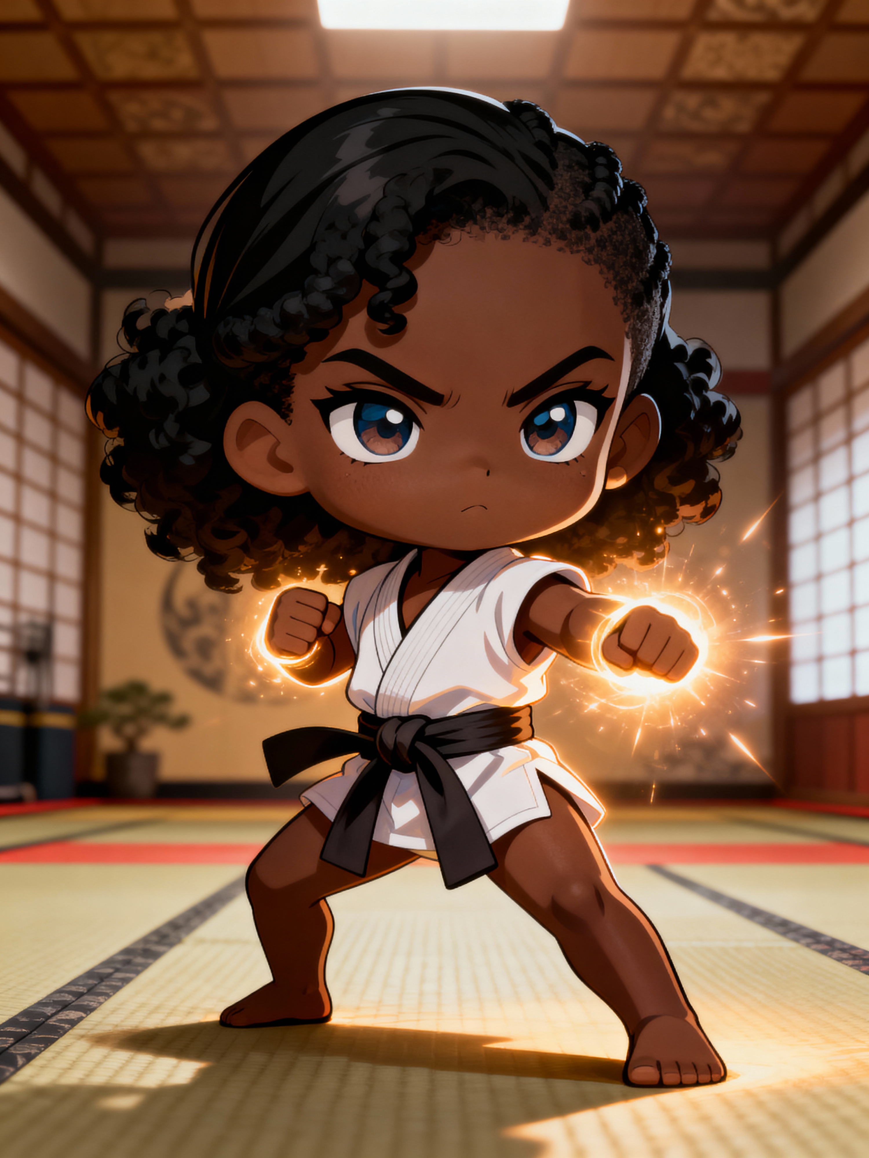 The model as a chibi martial artist, striking a pose with a glowing aura, wearing a mini gi with a big belt . The background is a classic anime dojo. The style is in cute chibi anime illustration.
