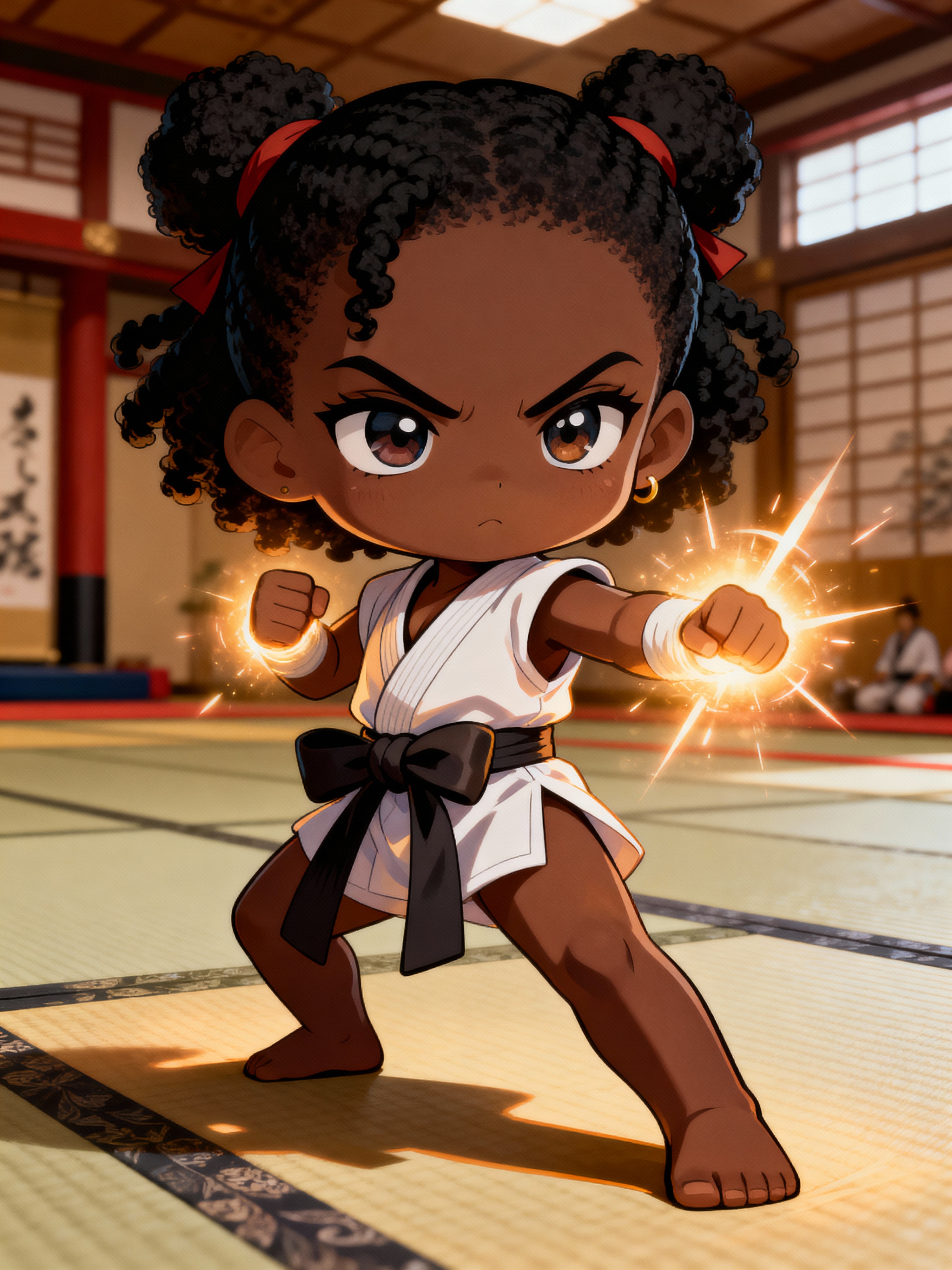 The model as a chibi martial artist, striking a pose with a glowing aura, wearing a mini gi with a big belt . The background is a classic anime dojo. The style is in cute chibi anime illustration.