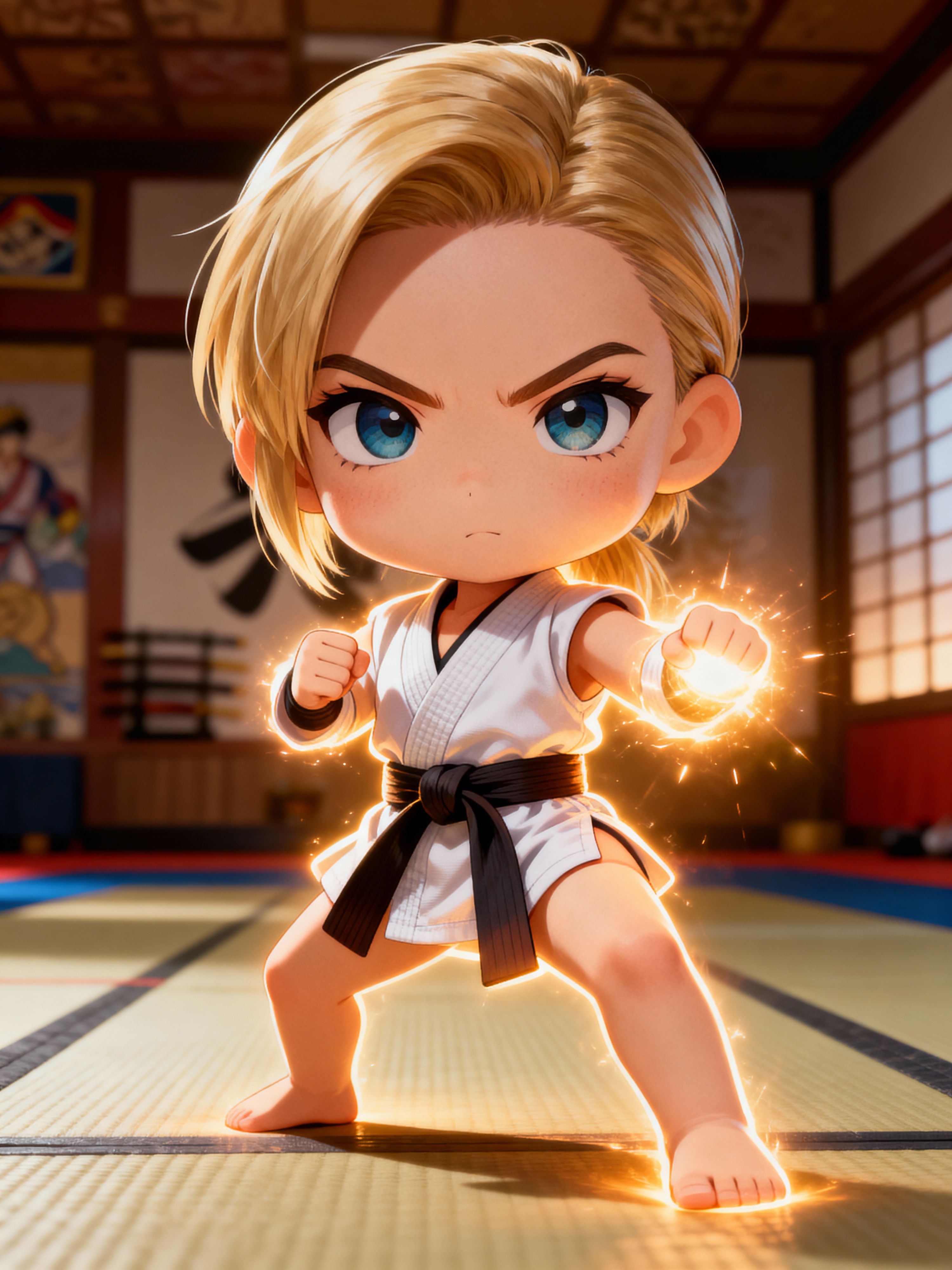 The model as a chibi martial artist, striking a pose with a glowing aura, wearing a mini gi with a big belt . The background is a classic anime dojo. The style is in cute chibi anime illustration.