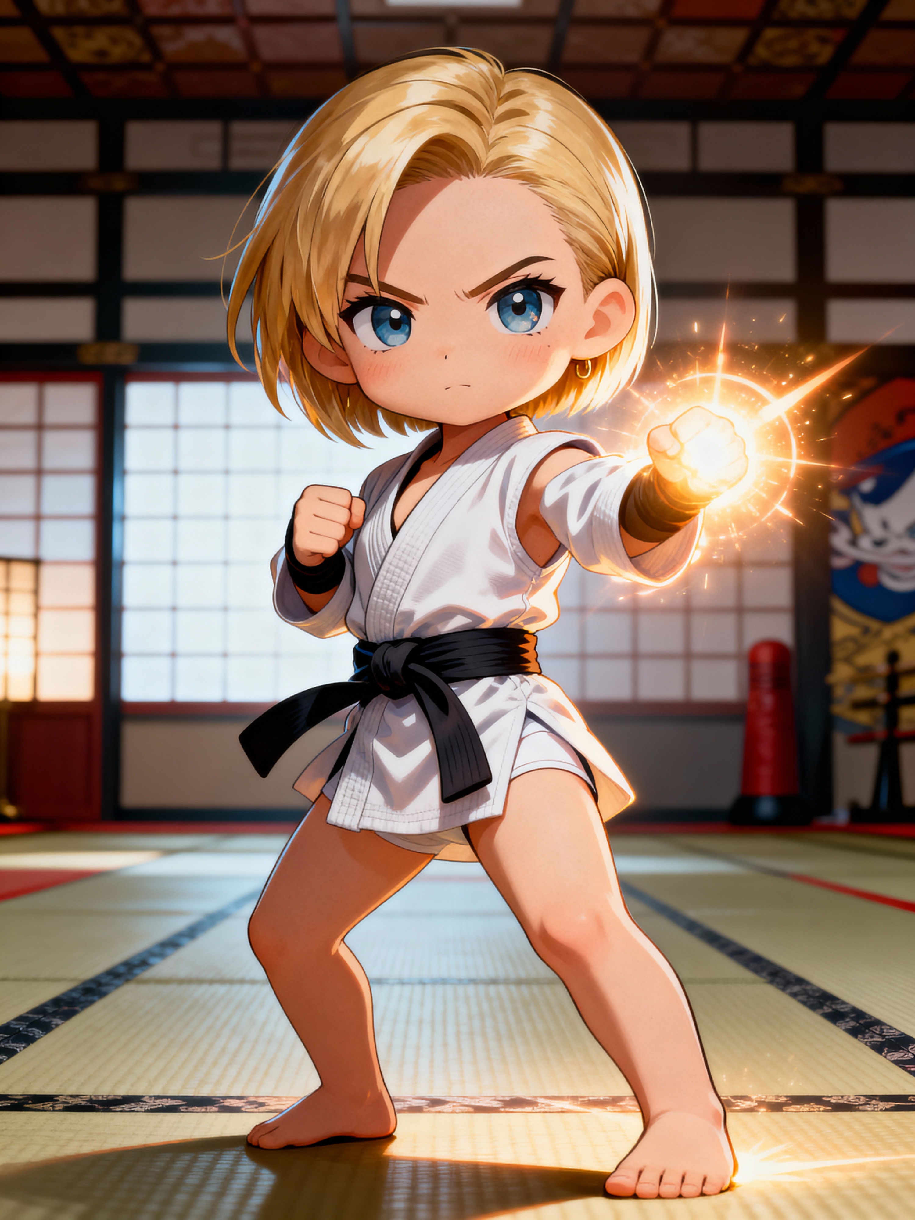 The model as a chibi martial artist, striking a pose with a glowing aura, wearing a mini gi with a big belt . The background is a classic anime dojo. The style is in cute chibi anime illustration.