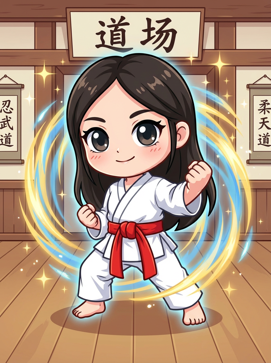 The model as a chibi martial artist, striking a pose with a glowing aura, wearing a mini gi with a big belt . The background is a classic anime dojo. The style is in cute chibi anime illustration.