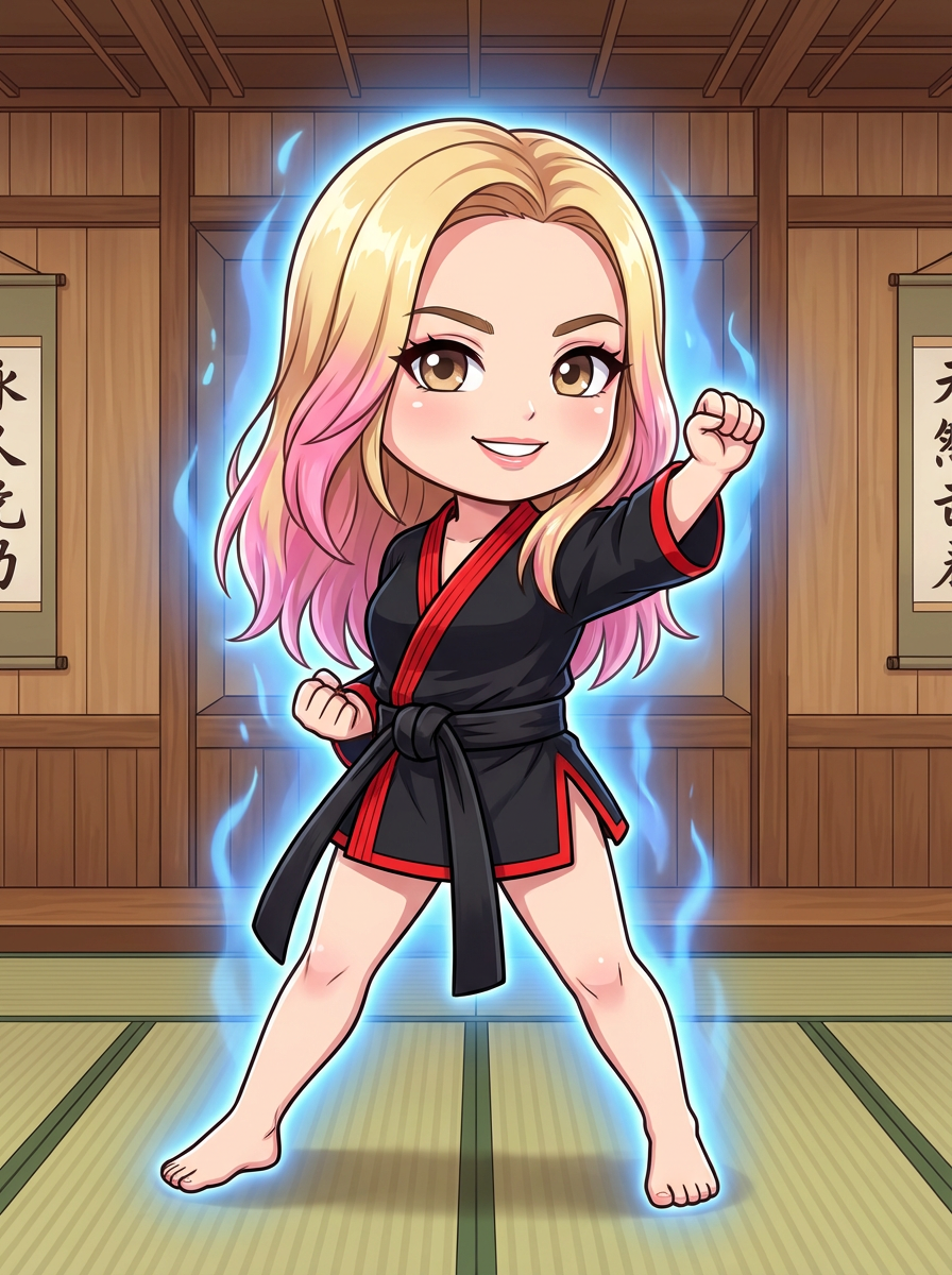 The model as a chibi martial artist, striking a pose with a glowing aura, wearing a mini gi with a big belt . The background is a classic anime dojo. The style is in cute chibi anime illustration.