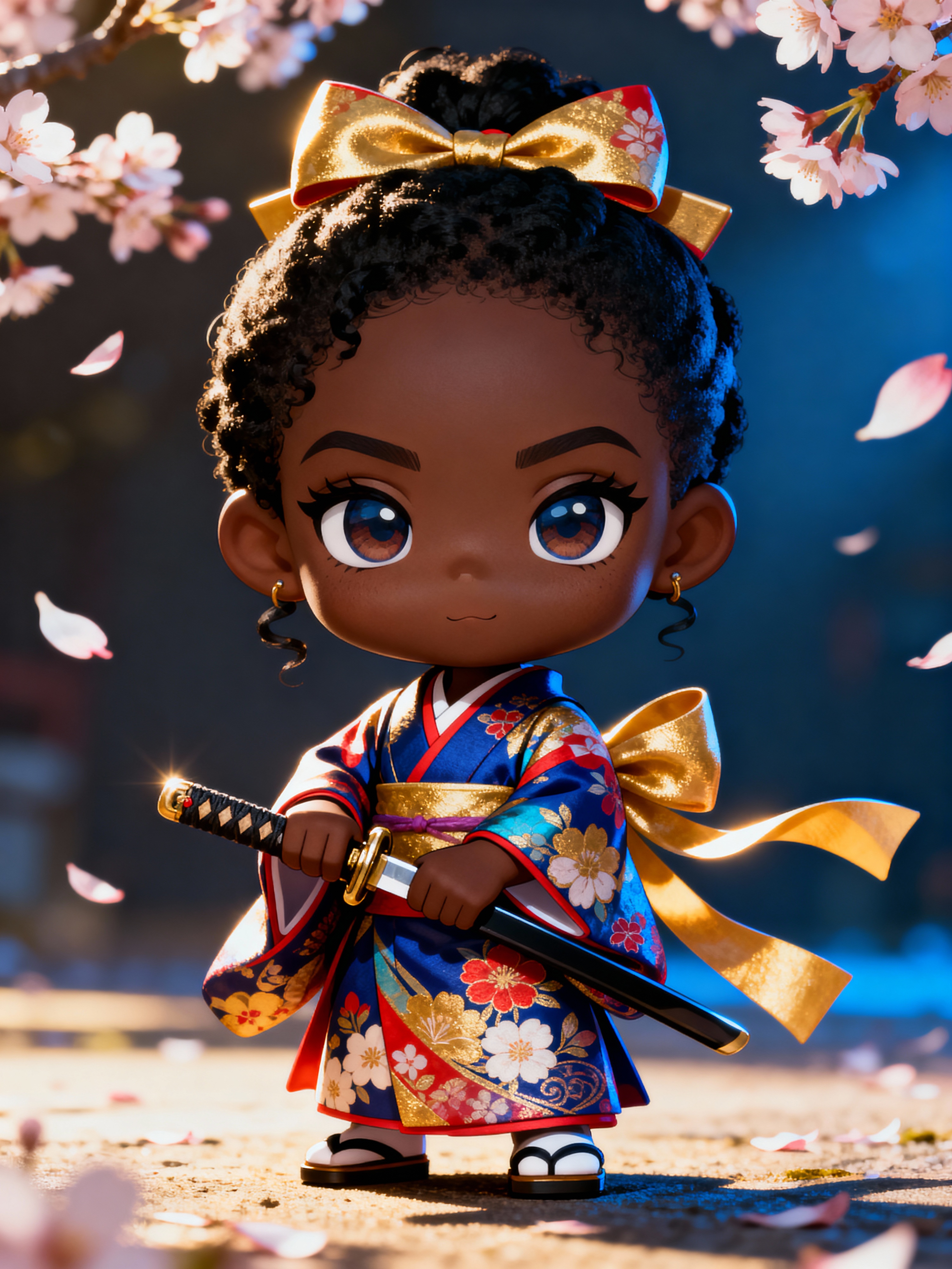 The model as a chibi samurai, holding a tiny katana, wearing a colorful kimono with floral patterns and a big bow . The background features falling cherry blossoms. The style is in cute chibi anime illustration.