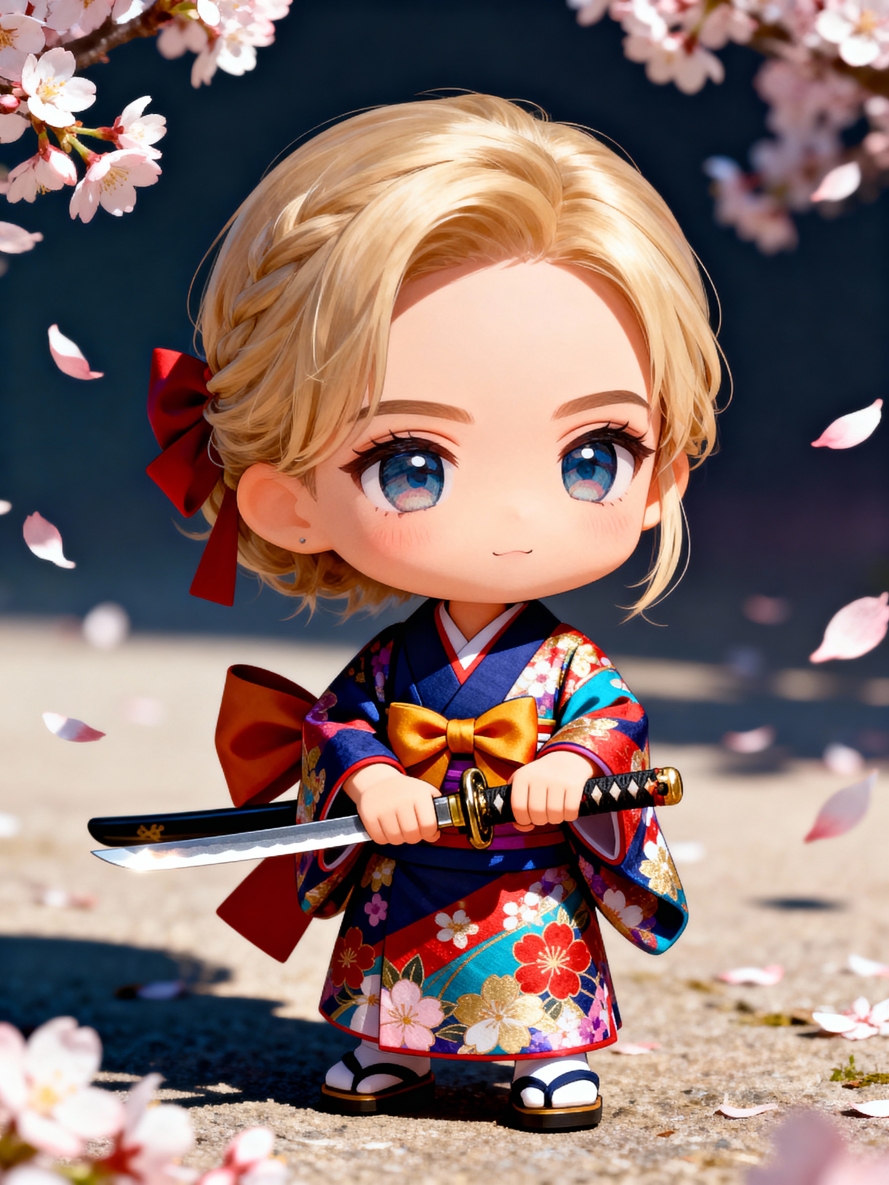 The model as a chibi samurai, holding a tiny katana, wearing a colorful kimono with floral patterns and a big bow . The background features falling cherry blossoms. The style is in cute chibi anime illustration.