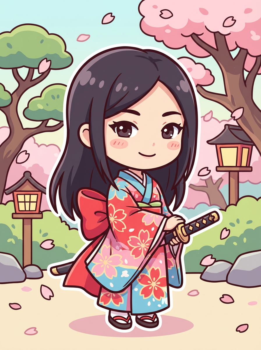 The model as a chibi samurai, holding a tiny katana, wearing a colorful kimono with floral patterns and a big bow . The background features falling cherry blossoms. The style is in cute chibi anime illustration.