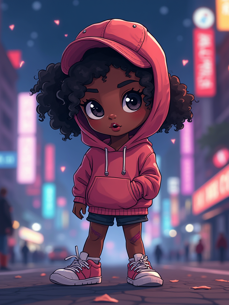 The model as a chibi streetwear character, wearing an oversized hoodie, sneakers, and a cute cap . The background is a neon-lit city at night. The style is in cute chibi anime illustration.