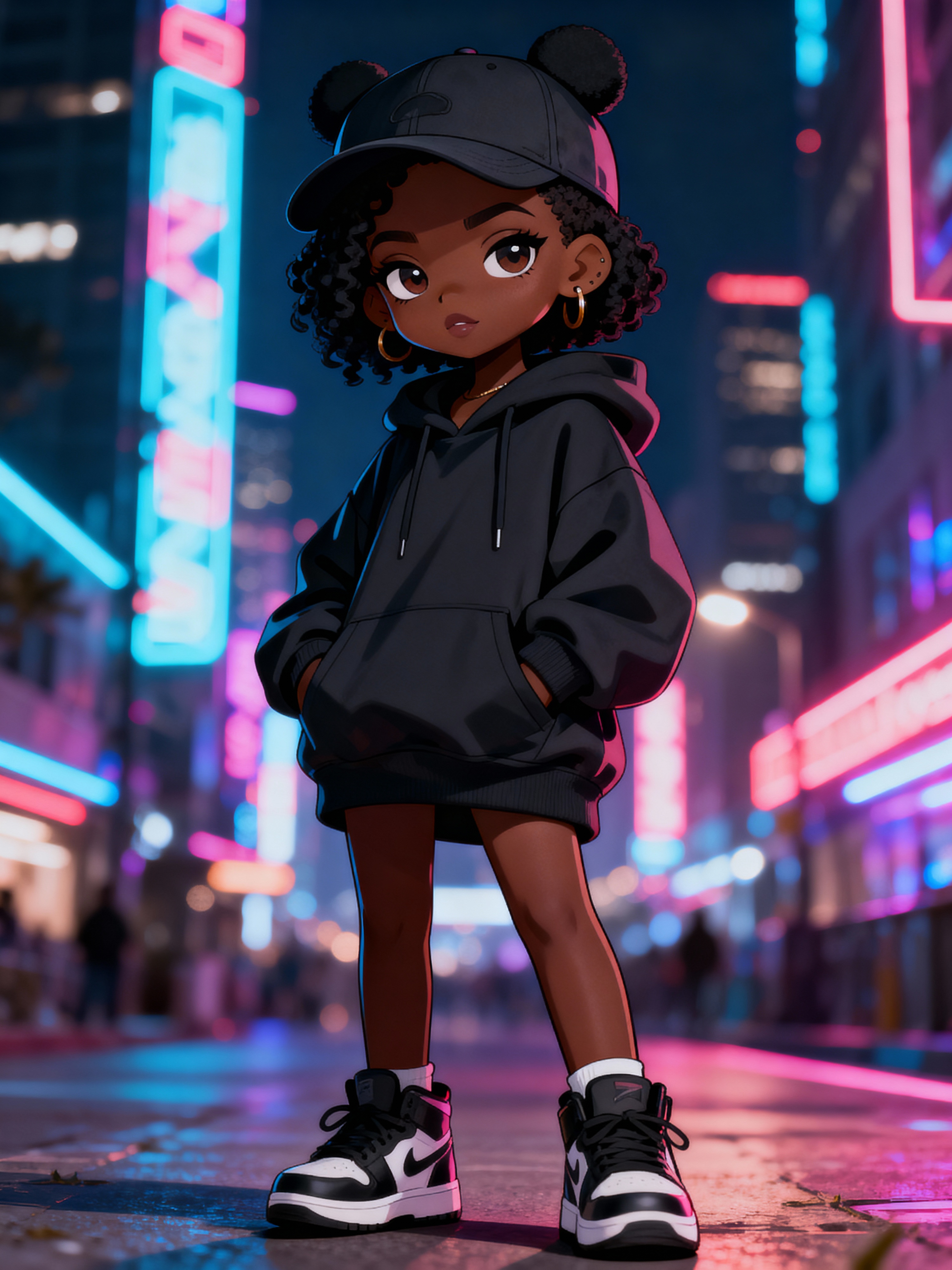 The model as a chibi streetwear character, wearing an oversized hoodie, sneakers, and a cute cap . The background is a neon-lit city at night. The style is in cute chibi anime illustration.