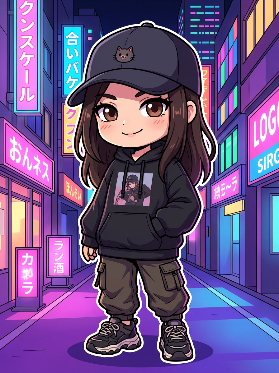 The model as a chibi streetwear character, wearing an oversized hoodie, sneakers, and a cute cap . The background is a neon-lit city at night. The style is in cute chibi anime illustration.