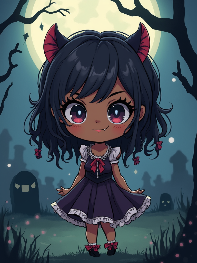 The model as a chibi vampire with tiny fangs and a mischievous smile, wearing a gothic dress with lace and ribbons . The setting is a moonlit graveyard. The style is in cute chibi anime illustration.