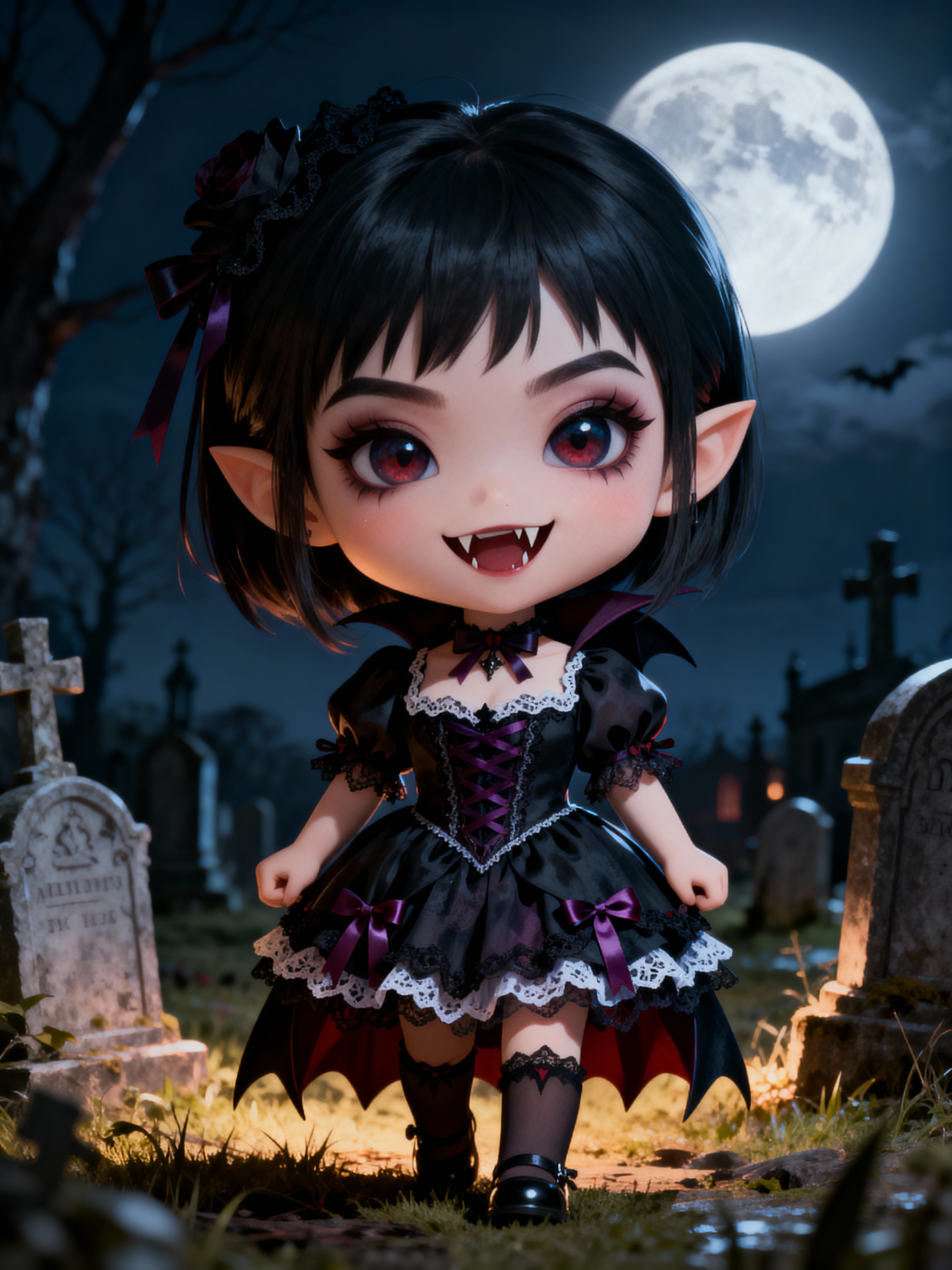 The model as a chibi vampire with tiny fangs and a mischievous smile, wearing a gothic dress with lace and ribbons . The setting is a moonlit graveyard. The style is in cute chibi anime illustration.