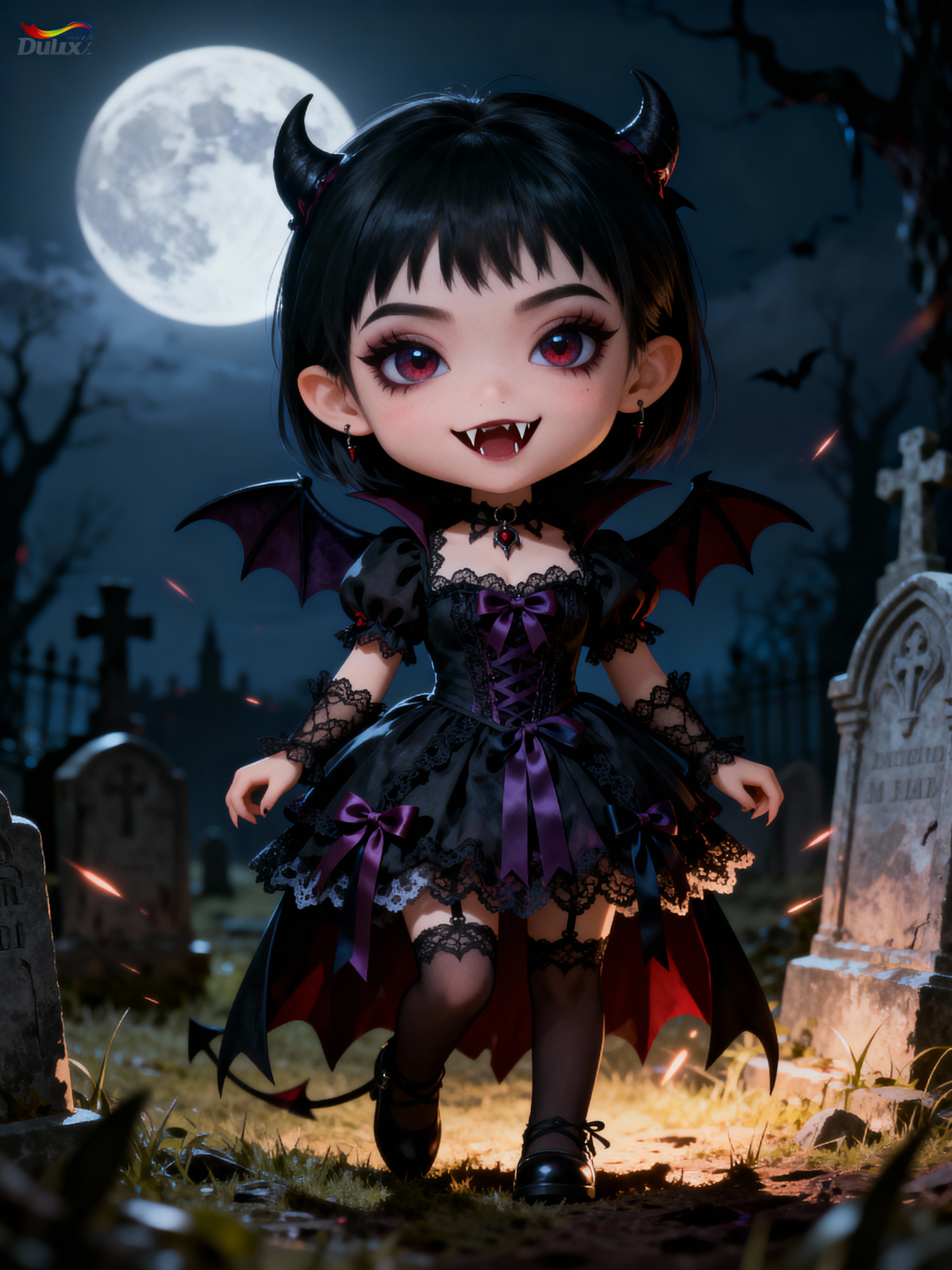 The model as a chibi vampire with tiny fangs and a mischievous smile, wearing a gothic dress with lace and ribbons . The setting is a moonlit graveyard. The style is in cute chibi anime illustration.