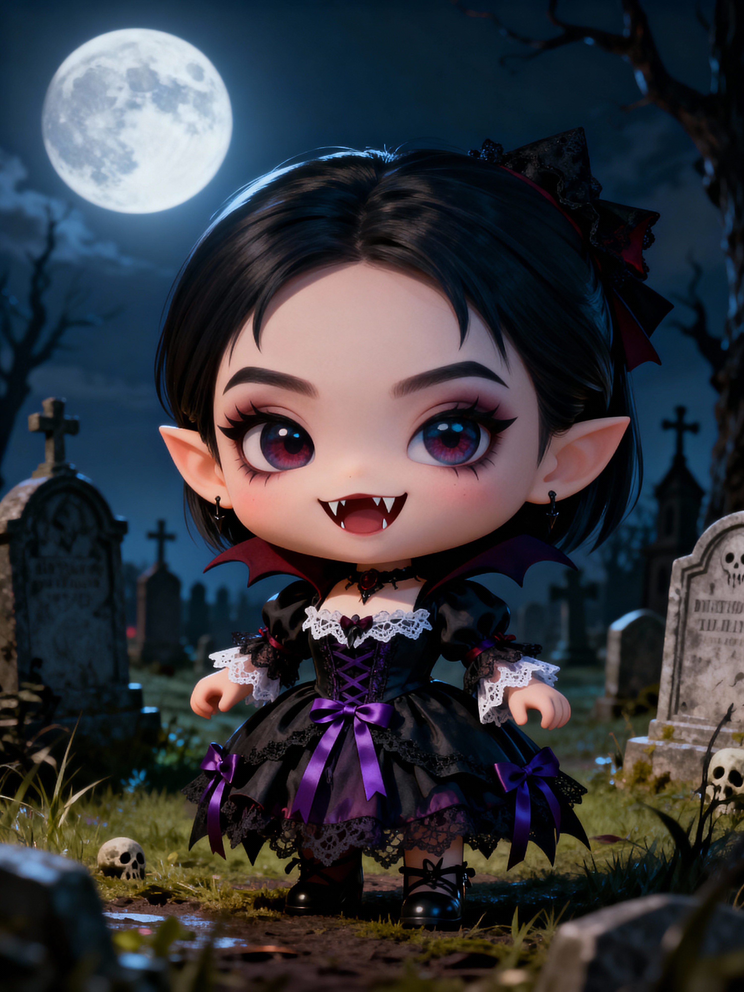 The model as a chibi vampire with tiny fangs and a mischievous smile, wearing a gothic dress with lace and ribbons . The setting is a moonlit graveyard. The style is in cute chibi anime illustration.