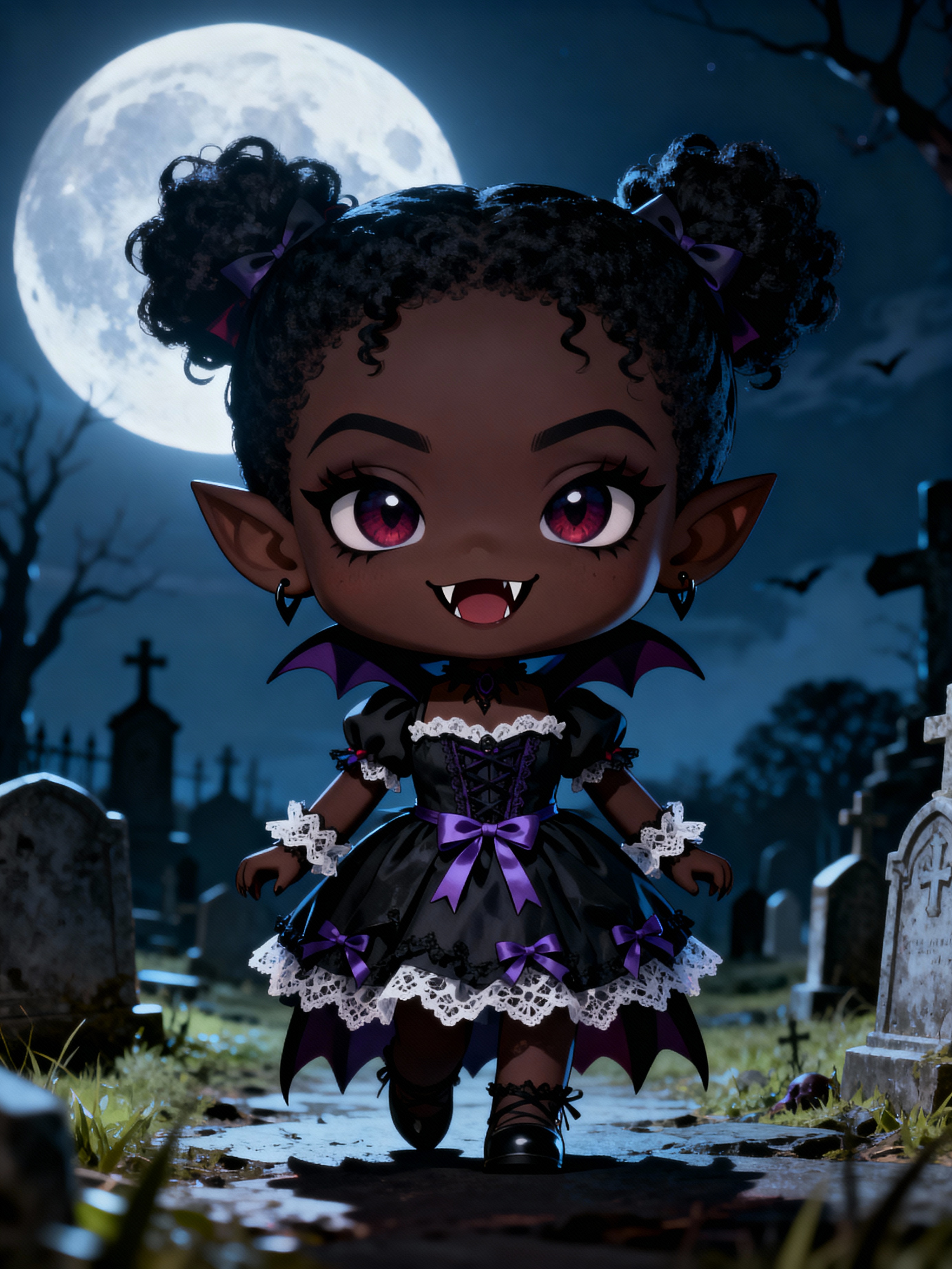 The model as a chibi vampire with tiny fangs and a mischievous smile, wearing a gothic dress with lace and ribbons . The setting is a moonlit graveyard. The style is in cute chibi anime illustration.