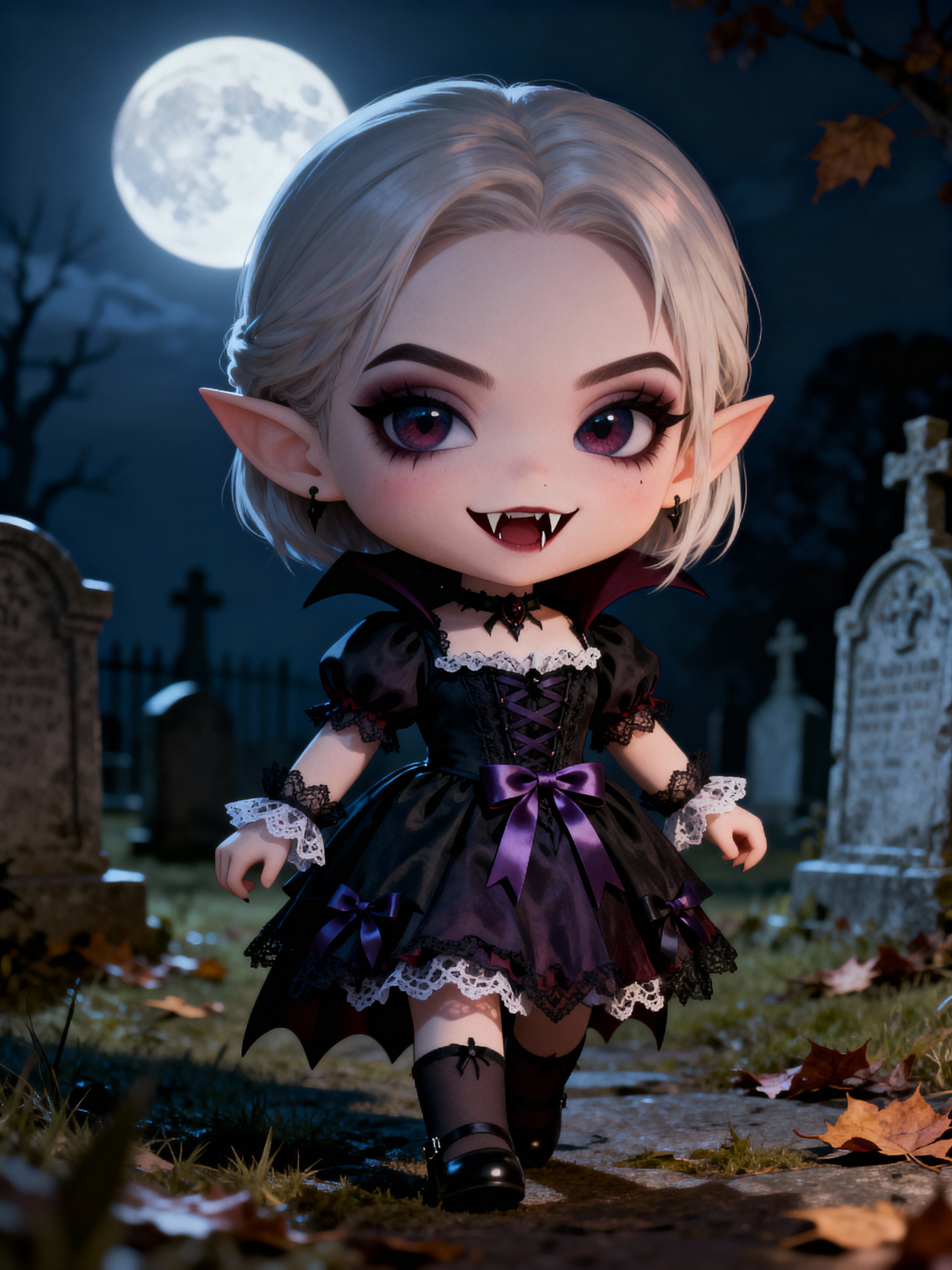 The model as a chibi vampire with tiny fangs and a mischievous smile, wearing a gothic dress with lace and ribbons . The setting is a moonlit graveyard. The style is in cute chibi anime illustration.