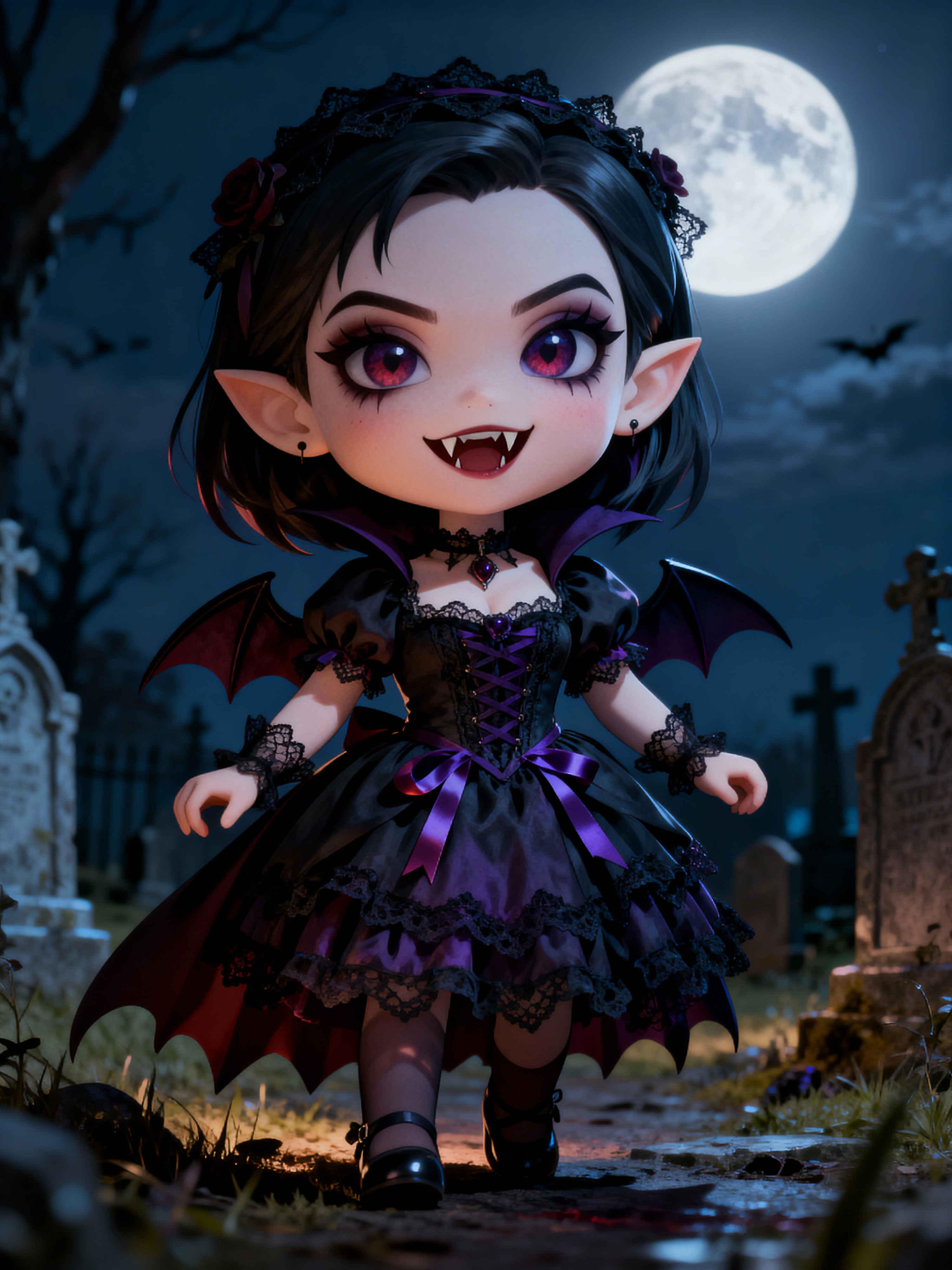 The model as a chibi vampire with tiny fangs and a mischievous smile, wearing a gothic dress with lace and ribbons . The setting is a moonlit graveyard. The style is in cute chibi anime illustration.
